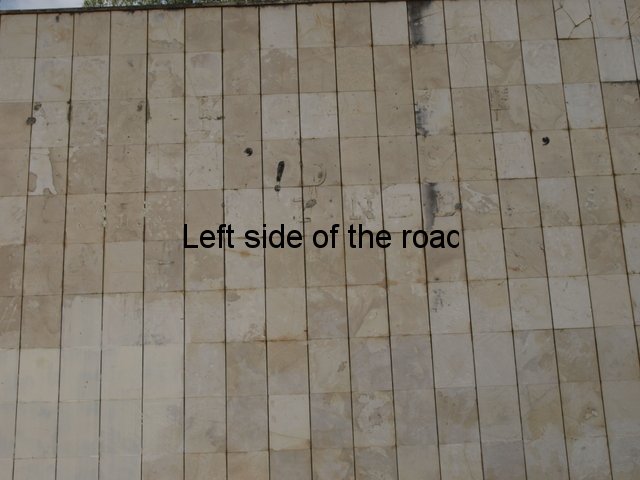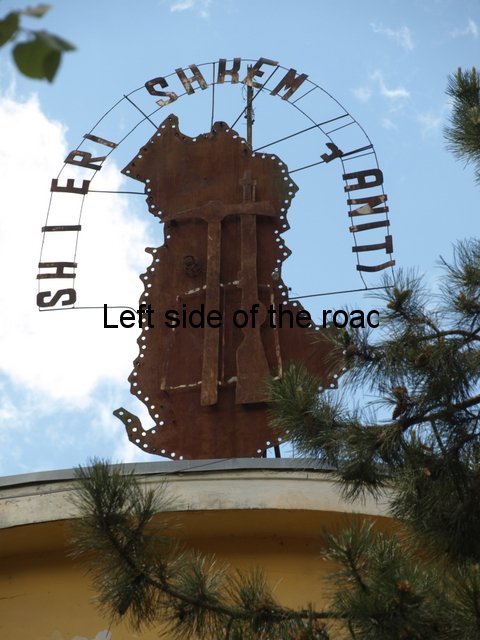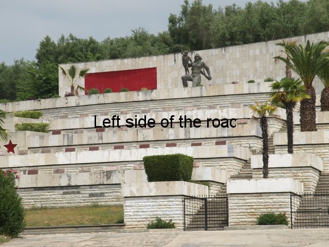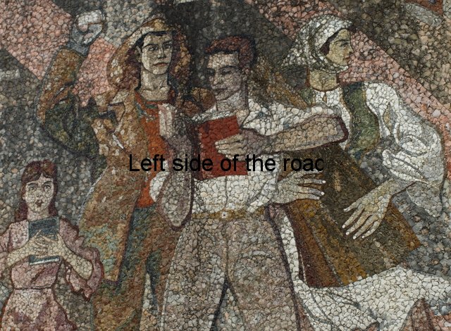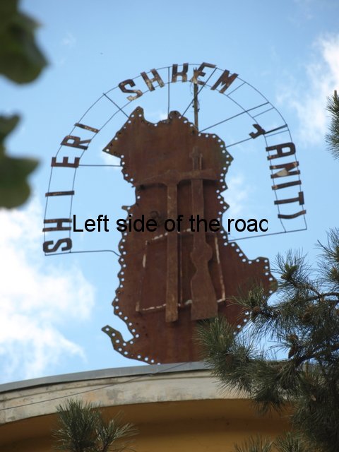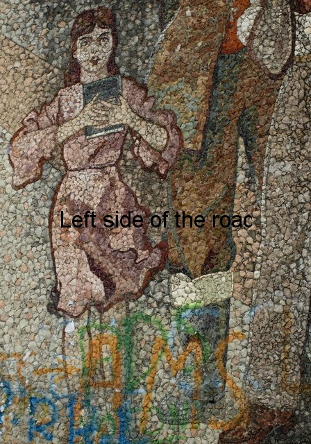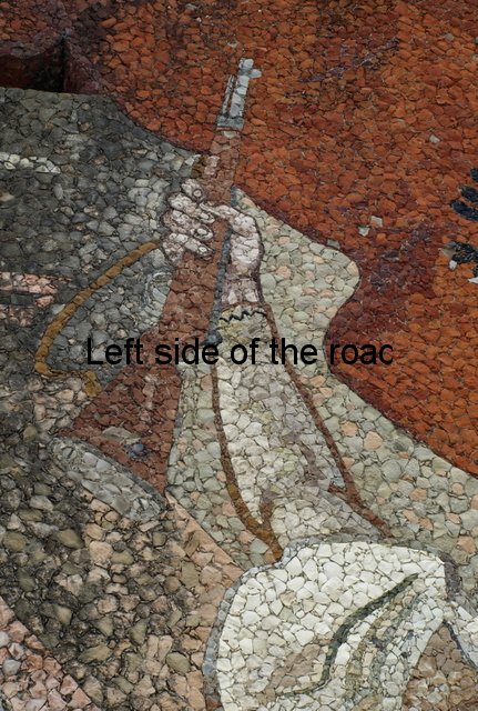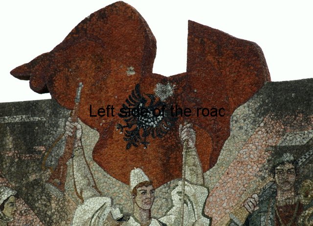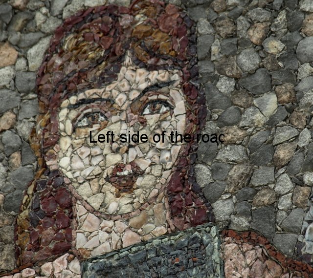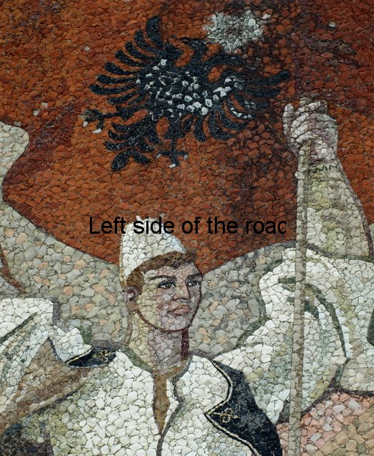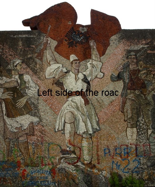 In all the mosaics I’ve been able to get really close to all the component parts have been natural stone, the design using the variations in colour found in different stones throughout the country. On the mosaic at the Durrës War Memorial these stones had been highly polished and you can see how much of a close-fitting jigsaw the artists have produced. On the other hand in Bestrovë they have also used natural stone but to create a different effect. It looks as if all the stones, of whatever colour, had been struck so that they broke off in the same way as ancient flint stone axes were made, with the same sort of uneven surface. Here all sizes of stone were used so it didn’t matter how irregular or how small the results were. Looking closely you can see that any gaps were just filled with tiny fragments. Not as precise as in Durrës because the desired effect was different.