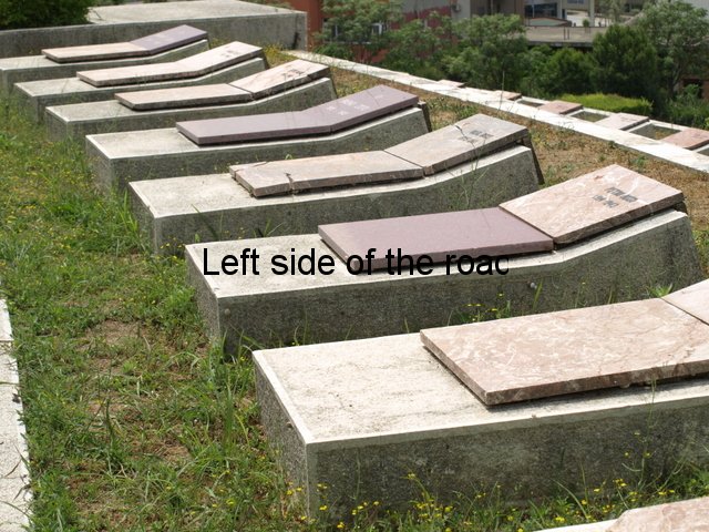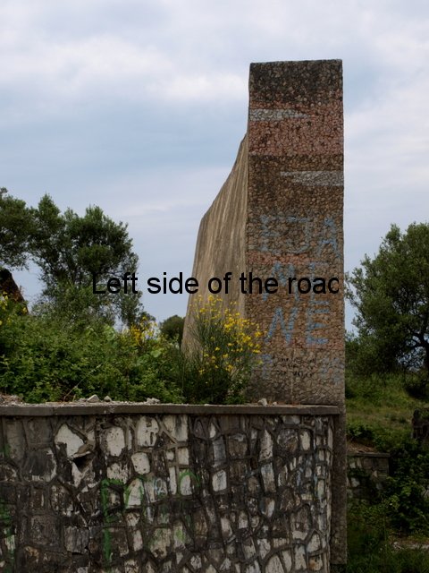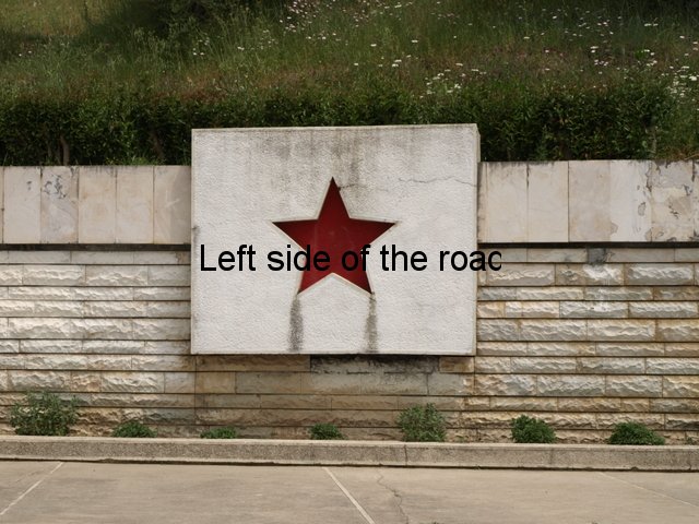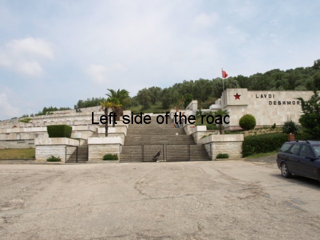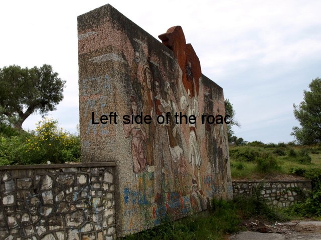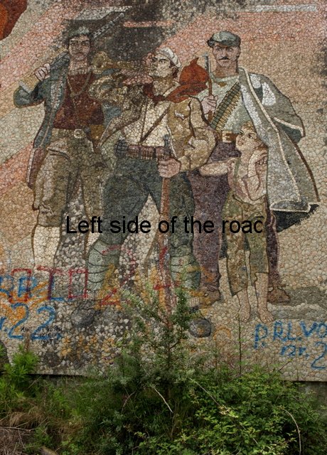 I’d love to know how this mosaic was constructed. It’s huge. The design is attached to a vast piece of rectangular concrete that I estimate to be about 4x9x1 metres (or about 12x30x3 feet). The image is on the north face, looking down towards the village of Bestrovë, but the geometric design is also on the narrow, side edges. There are only a few mosaics which come under the heading of ‘lapidars’ but this is the biggest I have seen – although still being dwarfed by ‘The Albanians’ in Tirana.