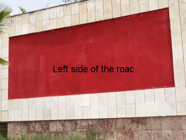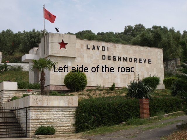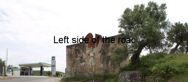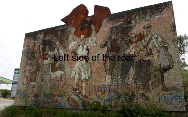 Beside the road on the route from Vlorë to the village of Bestrovë. As the road climbs, olive trees on both sides, you come to a summit with a petrol station on the right. The mosaic is on the other side of the road as the road starts to go downhill, about a kilometre before the village of Bestrovë itself. It’s difficult to see notice if you are coming from Vlorë as all you see is a large, nondescript concrete wall. There’s a bit of a pull-in right in front of the mosaic.