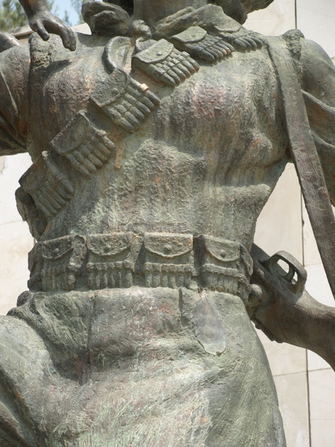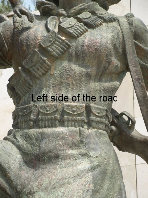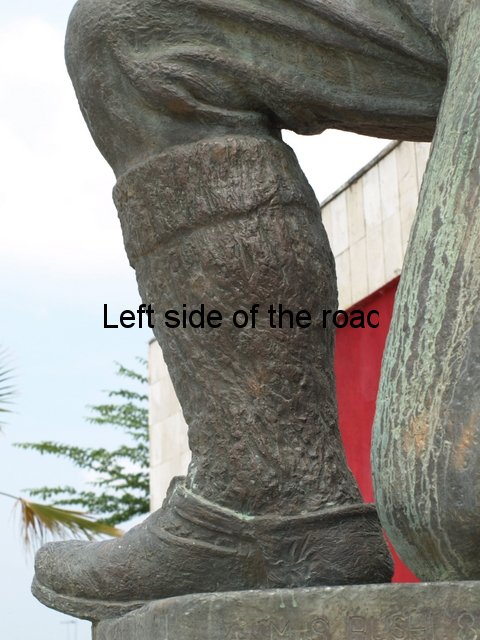 He’s dressed in a white fustanella (the dress like garment) and as both his arms are raised high this pulls open wide the black xhamadan (waistcoat). This has an interesting, geometric design embroidered on both the lapels of this waistcoat. The sleeves are much more voluminous than I’ve seen in other locations but this just adds to the dynamism of his stance. He has a red sash tied around his waist and even though it’s shown in stone you get the idea that it’s a fine piece of material, probably silk. On his head he wears a fez. As this is in the Vlorë region if he was just representing that area then perhaps he should have been wearing a qeleshe (very much like a skull-cap) but the desire here is to represent the whole country and not just one region. On his feet he wears the opinga (the hob nailed sandal) suitable for long days walking in the mountains. (A very clear example of these can be seen on the statue of the Drashovice Arch).
