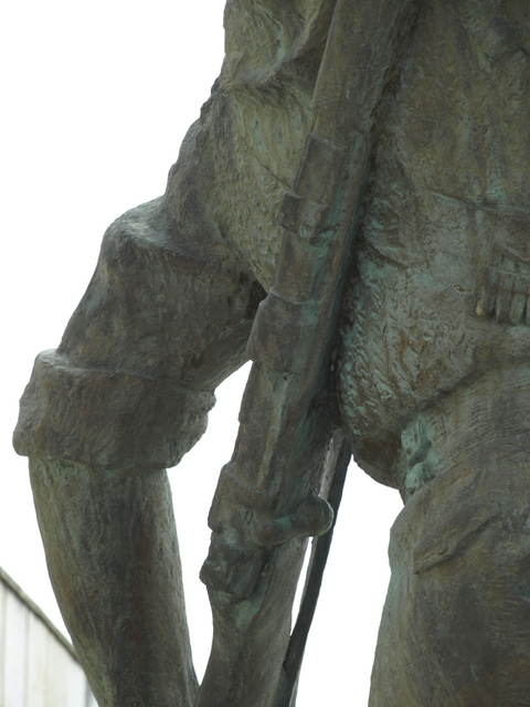 He stands facing the viewer, his legs wide apart and in his left hand he is holding his rifle, which has the butt resting on the ground, by the top of the barrel. (It’s this arm which the young boy is holding so there’s another connection between the solidarity of the figures and arms.) It’s what he’s holding in his right hand which makes him stand out in this tableau – he holds a trumpet and he has the mouthpiece to his lips.