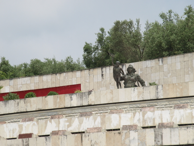 In the centre, and almost as tall as the monument is high, is a figure of a male dressed in Albanian traditional clothing. He is there as a representation of the country, a father figure who in his imagery links the past to the present (at least at the time of its construction).