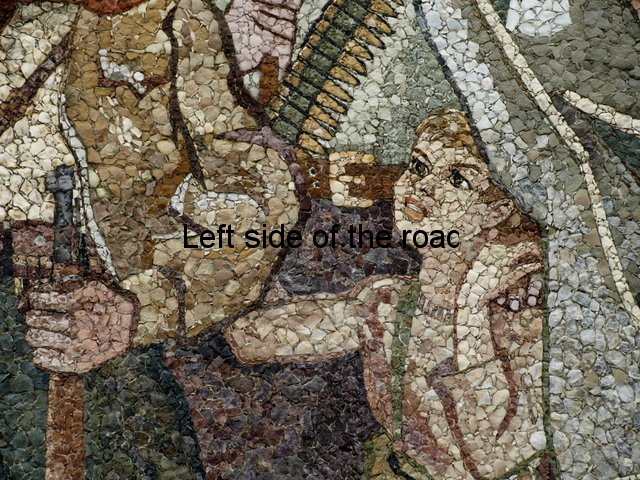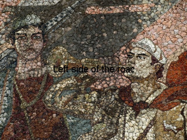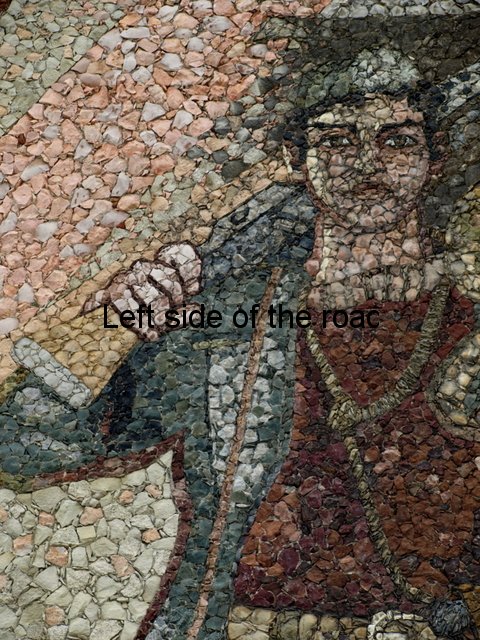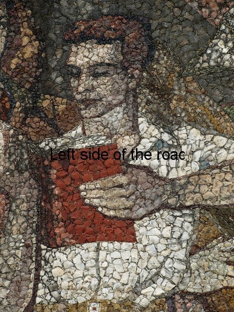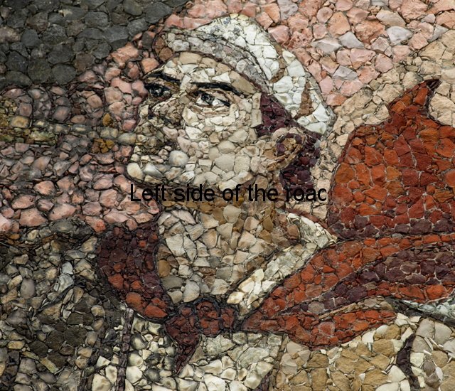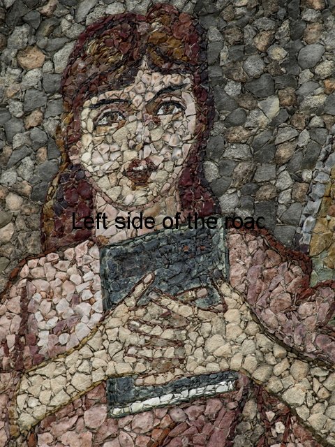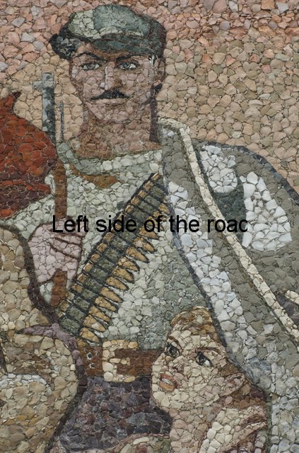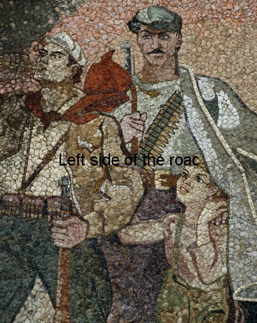 Now the cap is an indication of the re-writing of history that some are attempting in present day Albania. To me it is totally inconceivable that there were no red stars on the caps of any of the three Partisans. If most of the colours could be achieved with actual stones the crimson red of the star must have been painted on. The red of the flag is more of a rust colour than the red it would have been in real life, as is the scarf around the neck of one of the other Partisans. With such large areas it would be possible to use the stone, on the specifics of the star it would have been less realistic. Looking at other areas where a good, strong red was needed there are still remains of red paint.