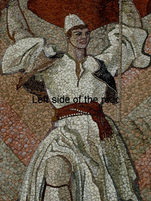 He stands on an uneven surface and so his right knee is slightly bent to maintain his equilibrium. This is a common device in Albanian lapidars, the mountains are such an integral part of the country’s history and culture that there’s always some idea of the terrain, especially when a figure, whether it be male of female, is an allegory for the country. One of the intricacies of the mosaic is that even the rock he stands upon is shown in a variety of colours, as it would be in reality. (This part of the mosaic is slightly obscured by spray can painted graffiti. This looks like the work of bored, but quite young, children, the limit of there attempts to change the art work limited by how high they could hold the can.)