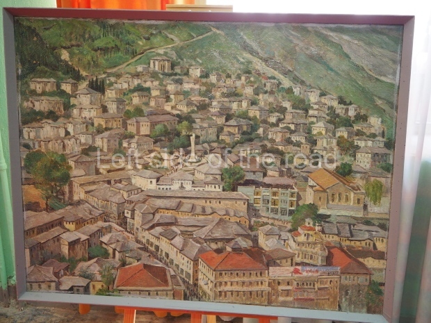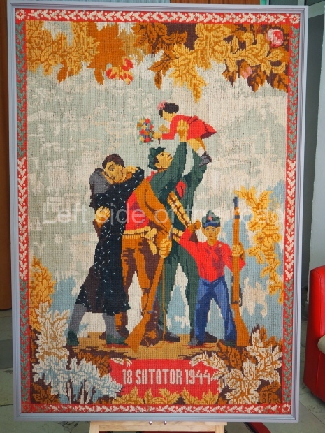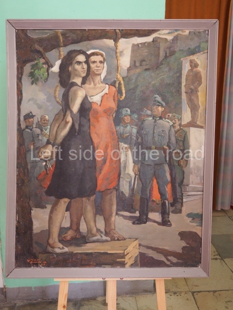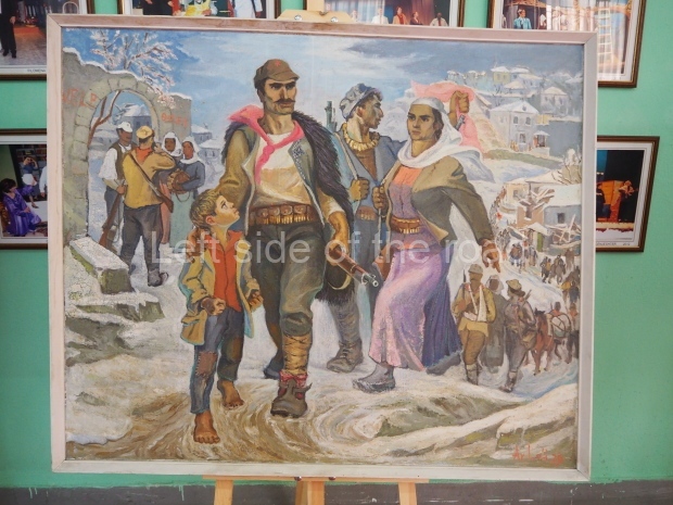 As part of this celebration there was a small exhibition of Socialist Realist Art in the entrance to the theatre – examples which are included in the slide show below. Some of these had been brought down from the Museum in the Castle for the occasion – and can be seen in the badly maintained and positively dirty museum at present. Others seems to have come from storage – as was the picture of Persefoni and Bule, the two so-called ‘Hanged Women of Gjirokaster’, two young, Partisan women, in their early twenties, who were publicly hung in the main square in the old town on July 17th 1944. This particular picture has been added as an update to the post on these two brave young Communist fighters.