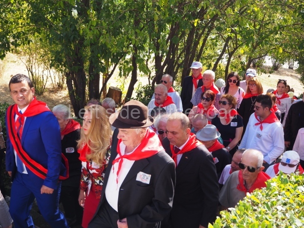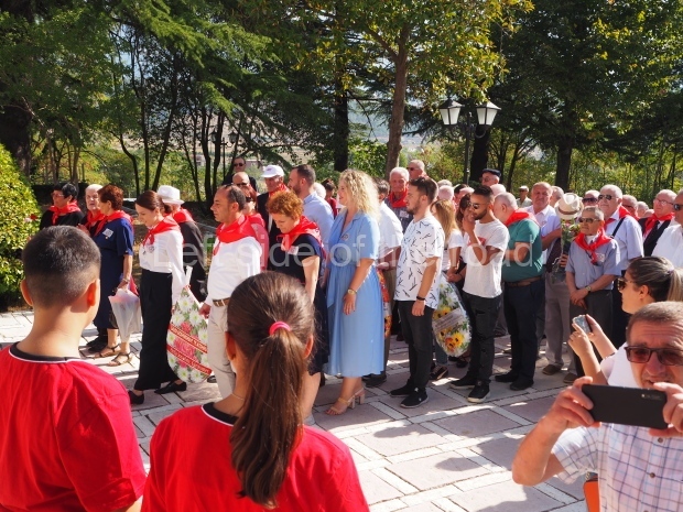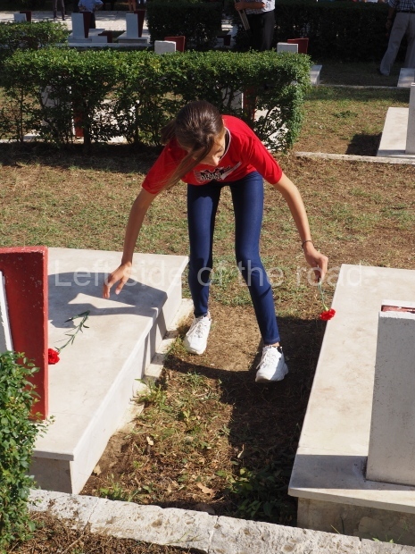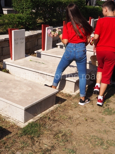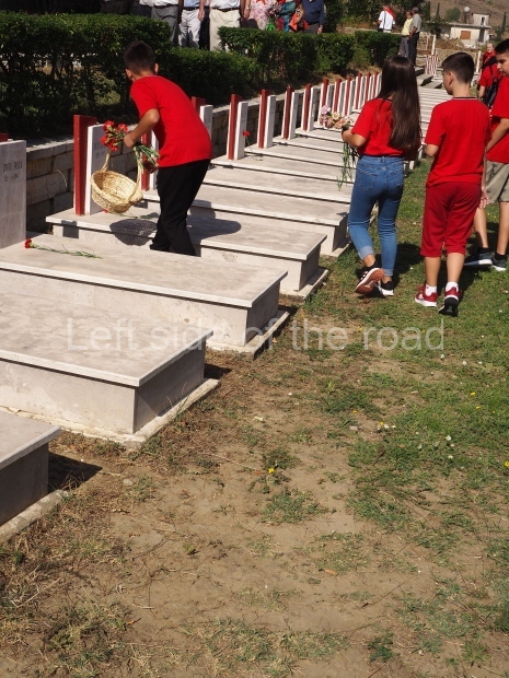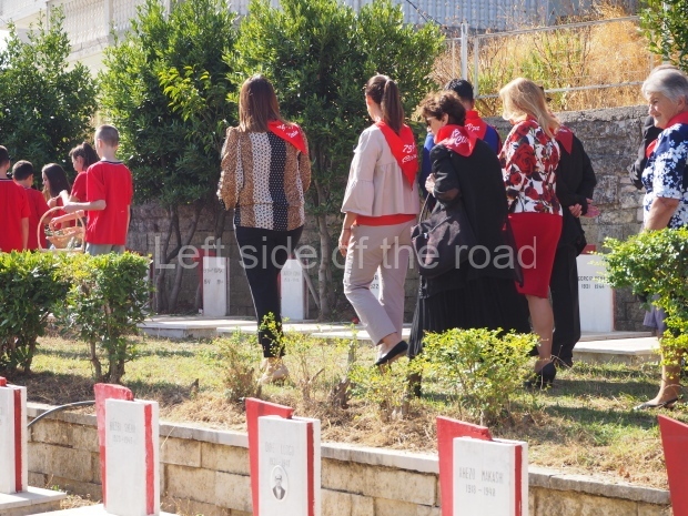 The tradition at ceremonies in the Martyrs’ cemeteries always consisted of children from the Young Pioneers standing at each of the tombs and during the ceremony a single red carnation would be placed on each tomb. As time passed it would obviously mean that many of the martyrs would not have any surviving relatives who might be able to place flowers on the tombs. By having the Young Pioneers do so, in a formal and organised manner, it meant that none of the anti-Fascist fighters were forgotten and left out. In 2019 it was again young people who brought baskets of flowers and then placed a single flower on each tomb – but these were older children, in their teens, rather than the younger, primary school children, who would have carried out the task pre-1990. (But someone ‘forgot’ to count the tombs as at the end of the flower distribution there were still quite a number without a flower.)