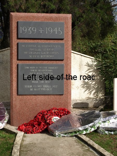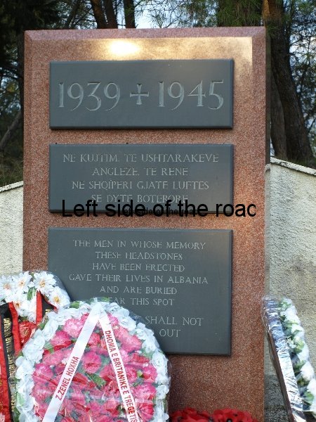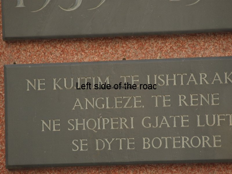 The Albanian: ‘Ne kujtim te ushtarakeve Angleze te rene ne Shqiperi gjate luftes se dyte boterore’ translates as: ‘In memory of the British military who fell in Albania during World War II’