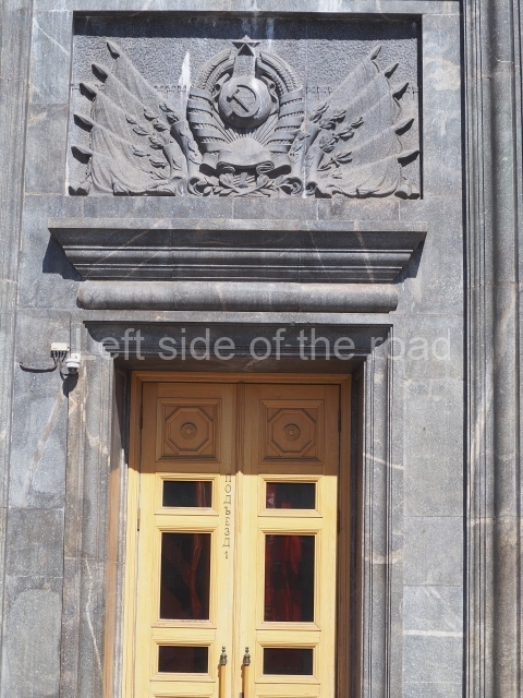 The lobby is lined with light marble. The walls, columns, friezes on the walls as well as the floors are carpeted in polished black granite. The stained glass doors, door frames, capitals and grilles are made of brass and brass-anodised aluminium. Four escalators lead from the vestibule to the underground cloakroom.