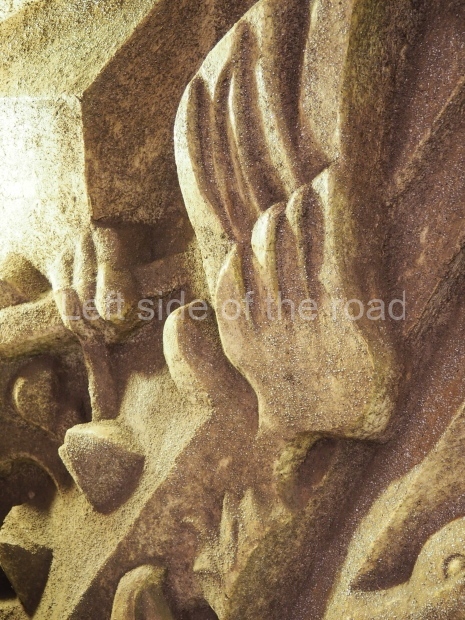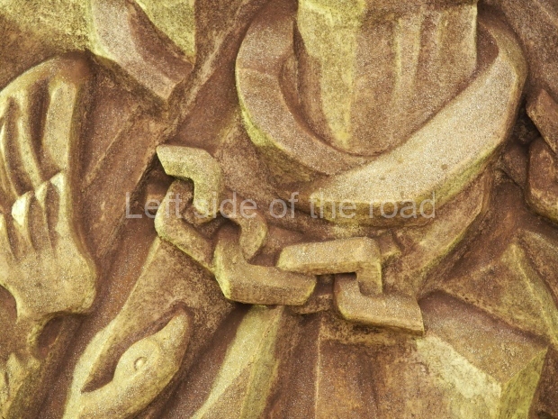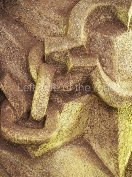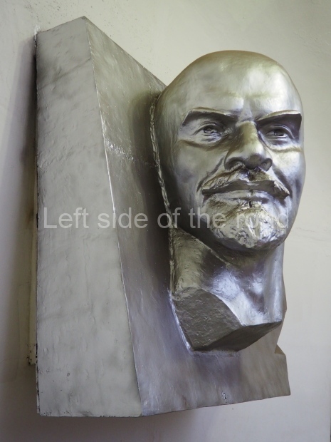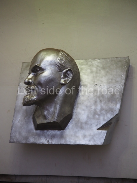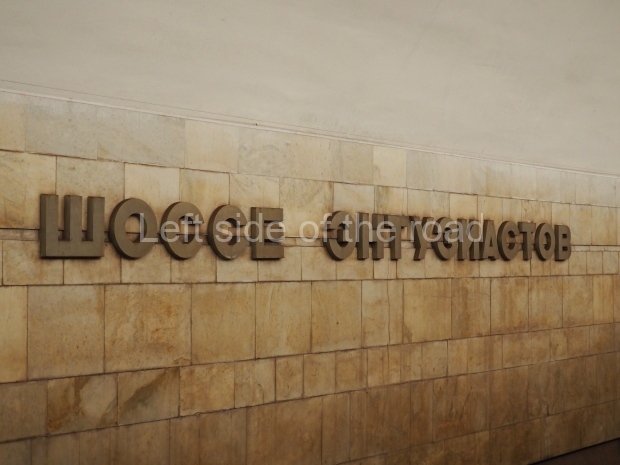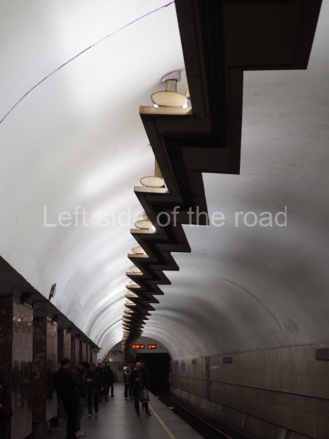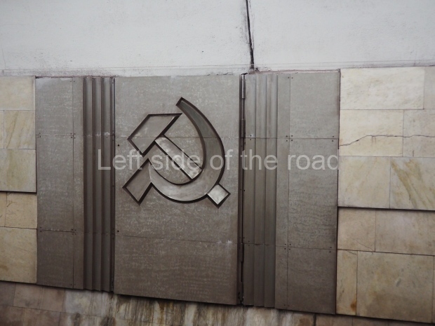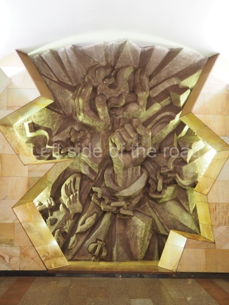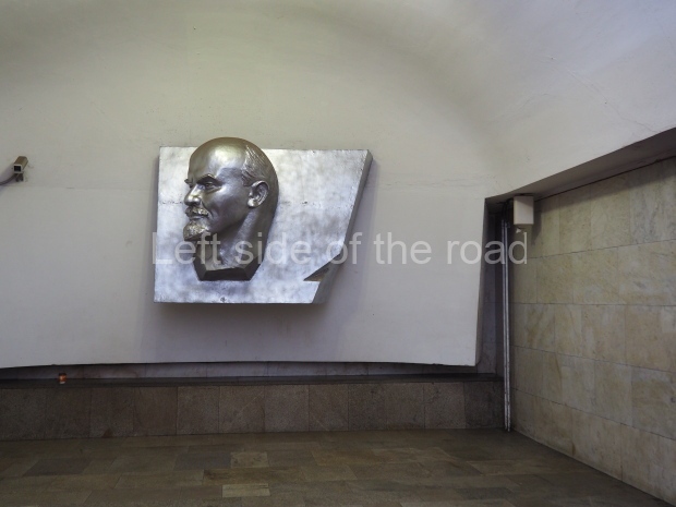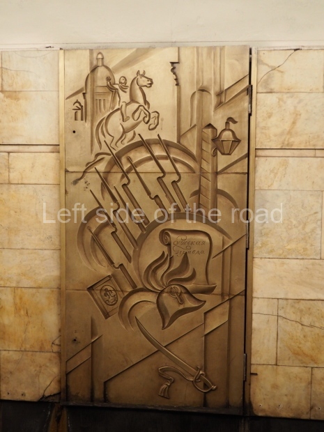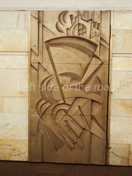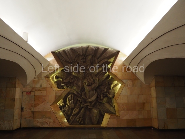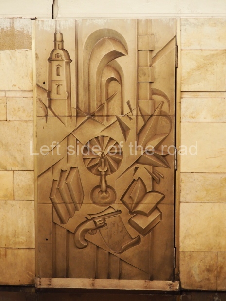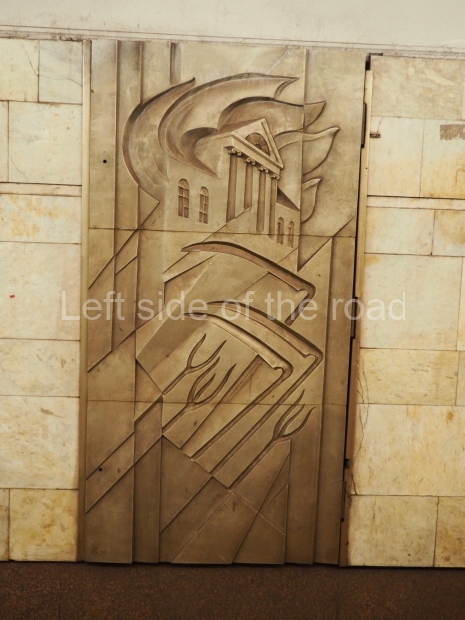 The station walls are faced with white koelga marble, which are punctuated by metallic artworks depicting the hammer and sickle. Thick cubic shaped pylons are faced with dark red marble seliyeti, ‘rest’ on a laboradorite socle. The floor is covered with red and grey granite, whilst lightning elements are mounted into a metallic carcass that is fixed to top of the vaults, a straight one for the central hall, and a zig-zagged shaped for the platform. At the rear of the central hall is a large bas-relief of Vladimir Lenin created by the People’s Artist of the USSR, Nikolai Tomsky.