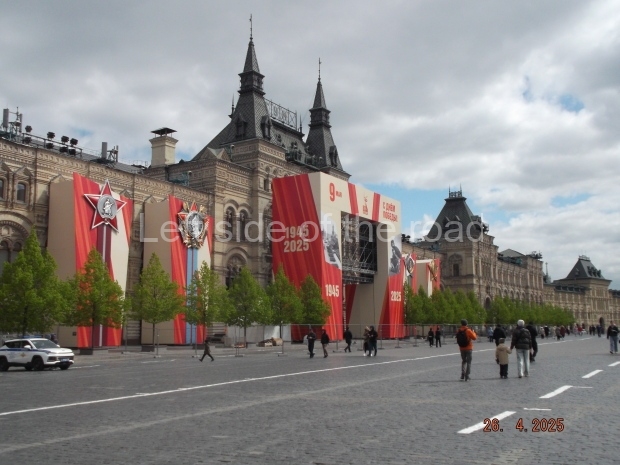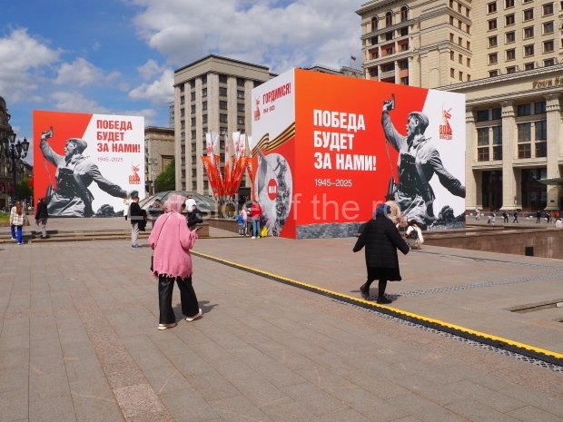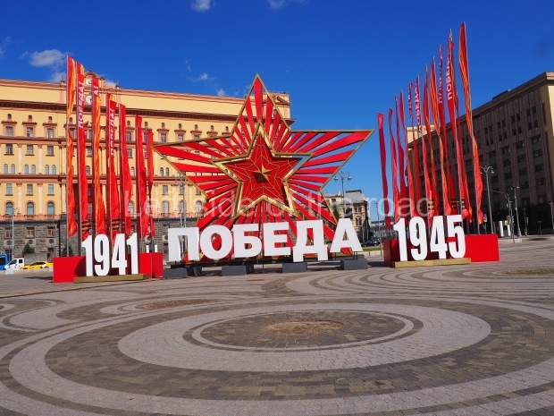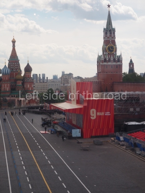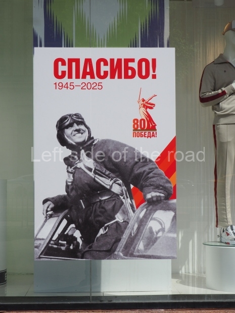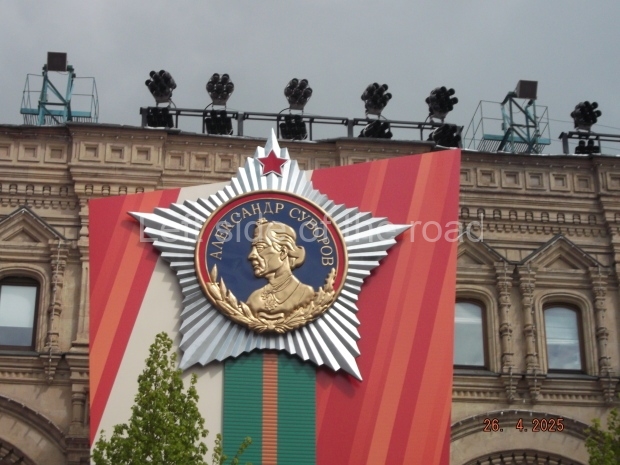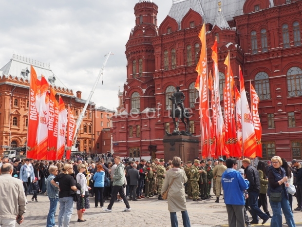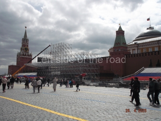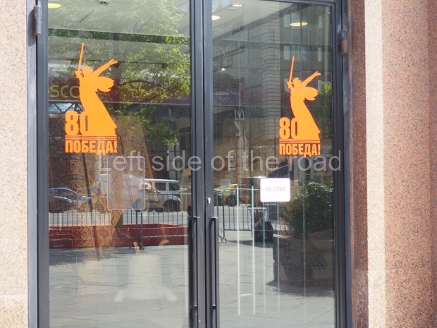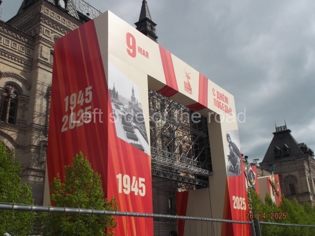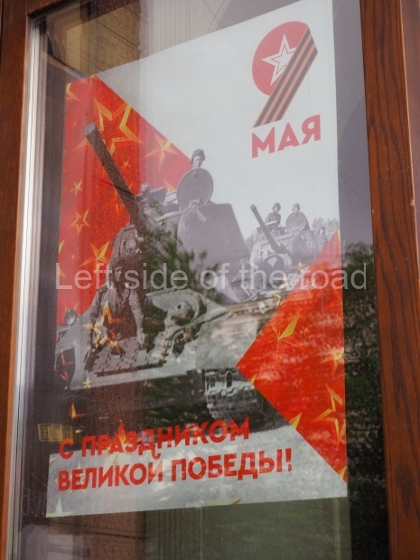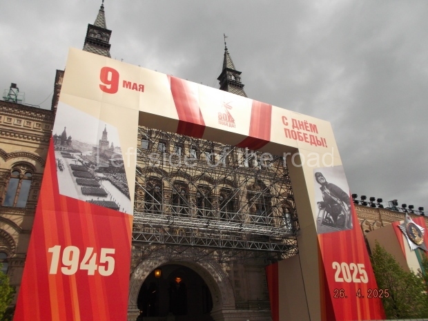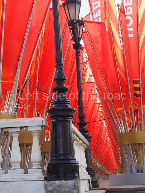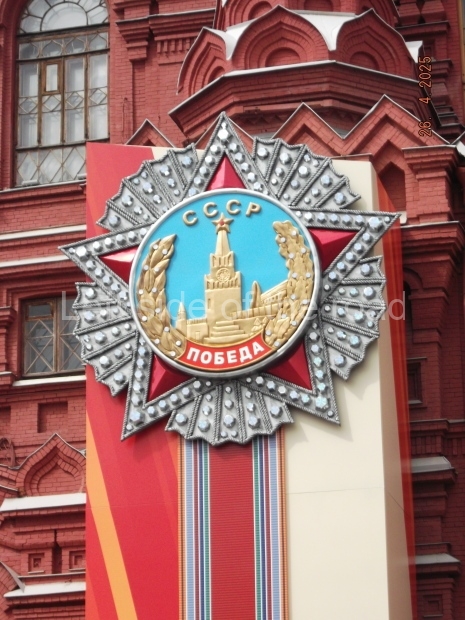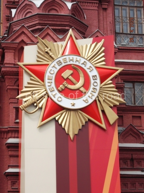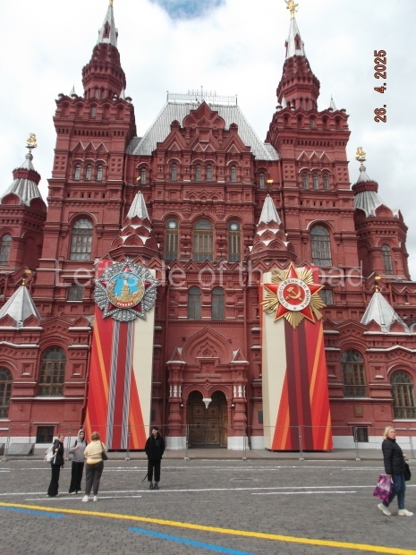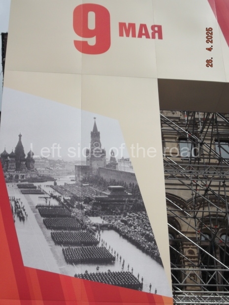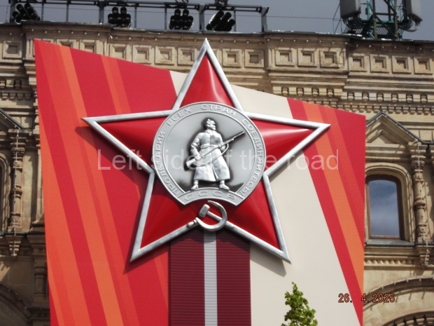 I can only guess who this is supposed to be. My suggestion is that this is a representation of Tsar Ivan IV ‘The Terrible’. He fits into the time scale and he had a relationship with Moscow (as ‘Grand Prince of Moscow from 1533-1547, before he became Tsar and it was in this period that the St Basil’s Cathedral – the multi coloured, domed building at the end of Red Square – was built). But why he should make an appearance in a celebration of a victory by revolutionary workers and peasants I don’t know.