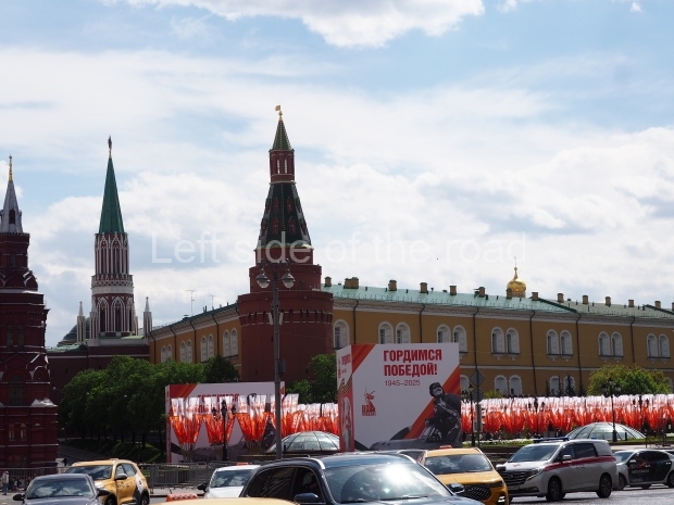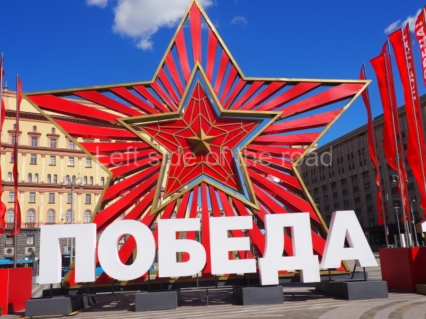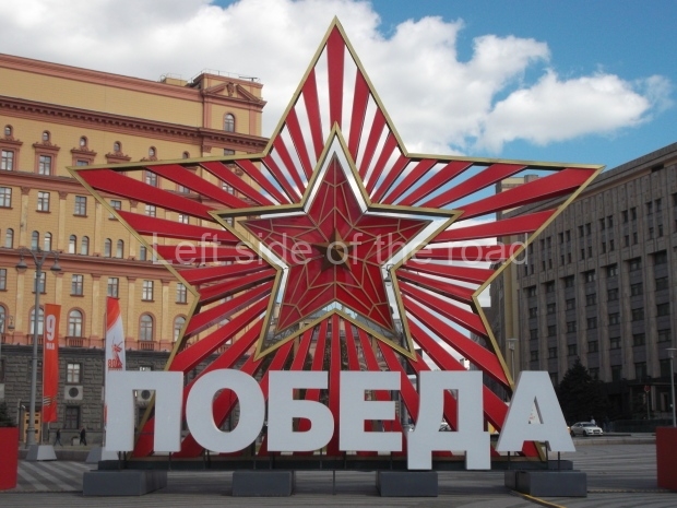 And what they are defending is the city of Moscow. Whereas the tanks and soldiers were in yellow and brownish stone the city itself, in the background, is constructed of gradations of green stone. We know it’s Moscow as three of the iconic towers of the Kremlin are shown with their distinctive red stars. Those stars, lit up at night, still shine to this day. During Soviet times the ‘Hammer and Sickle’ was attached to the stars but unfortunately they have been removed now. The other towers in the image have flags flying from their summits.