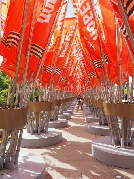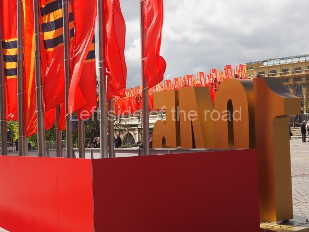 First there’s an oval sports stadium. from inside this structure a very tall flag pole emerges and it flies a flag with the letters ‘CCCP’ (USSR). Below the stadium is another symbol I haven’t yet been able to work out.