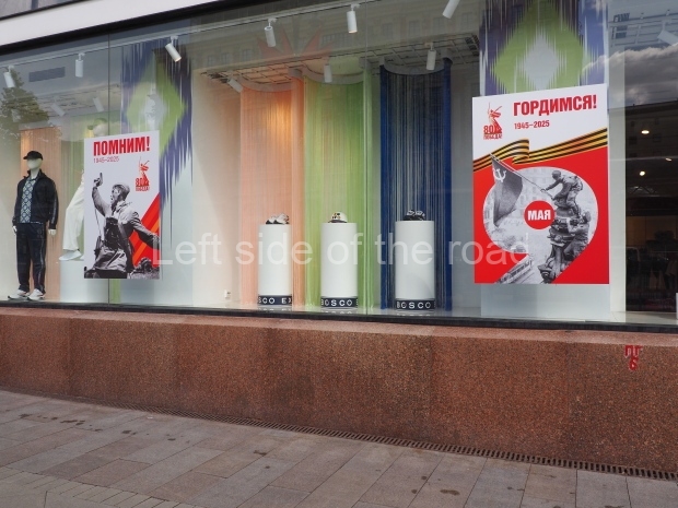 The large mosaic at the top of the escalators is very different, in many ways, from those that run alongside the platforms below. The materials that make up the mosaic are different; here they are much larger pieces of cut stone, which covers a range from brown through to green and on to yellow. The feel is also different in that this is one of celebration, the celebration of the end of the blockade of Moscow (that lasted from October 1941 to January 1942) and the beginning of the counter-attack which would eventually lead to the destruction of the Hitlerite forces in their own lair in Berlin in May 1945.