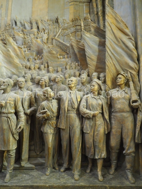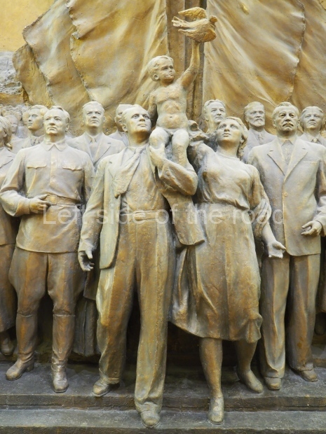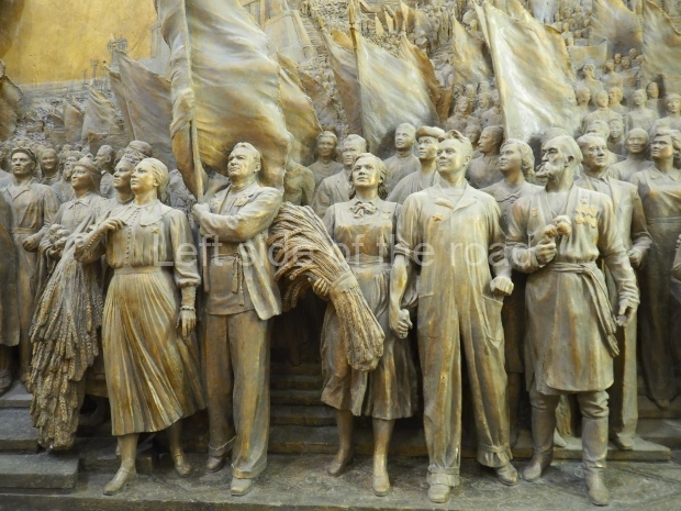 Next in our tour is the hall dedicated to Victory of the Soviet people in the Great Patriotic War and the struggle for peace. There, we come to a high-relief sculpture group made of gypsum and painted bronze: Glory to the Soviet People, Flag-Bearer of Peace! It was made by Evgeny Vuchetich and his team of sculptors. It was covered by a faux wall in the 1960s, and simply bricked over later.