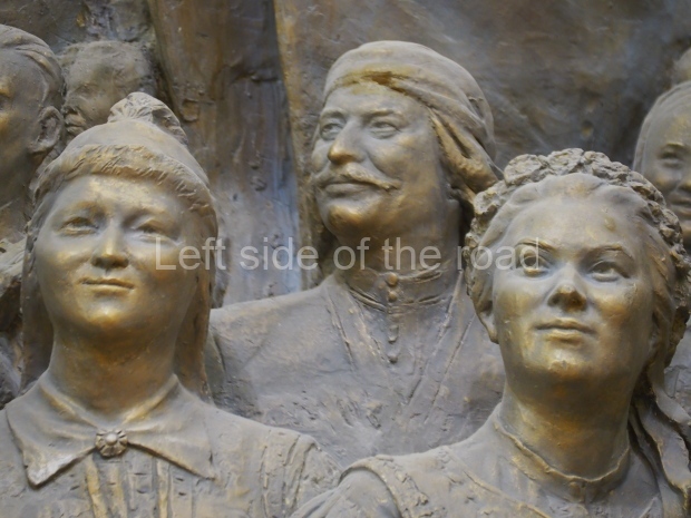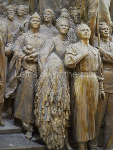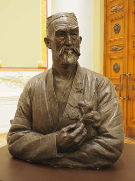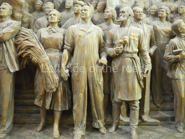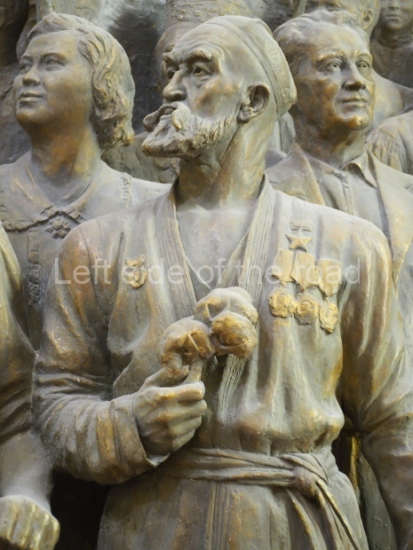 When they found it, sculptures were in a sad state, many pieces had been damaged. They had to be recreated based on old photographs. We think now that those characters were modelled after real people. For instance, the Uzbek man on the right, wearing a national robe and a skullcap is Nazarali Niyazov, Hero of Socialist Labour. He invented a new cotton field irrigation method. Vuchetich had made a chest-high sculpture of him before the high relief project commenced and later used that as a base for a full-height sculpture.