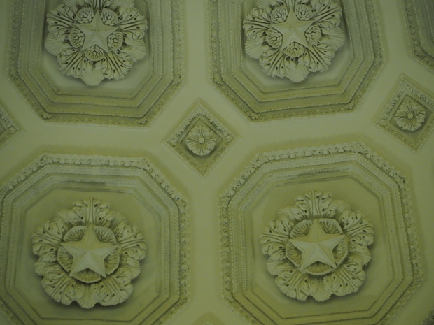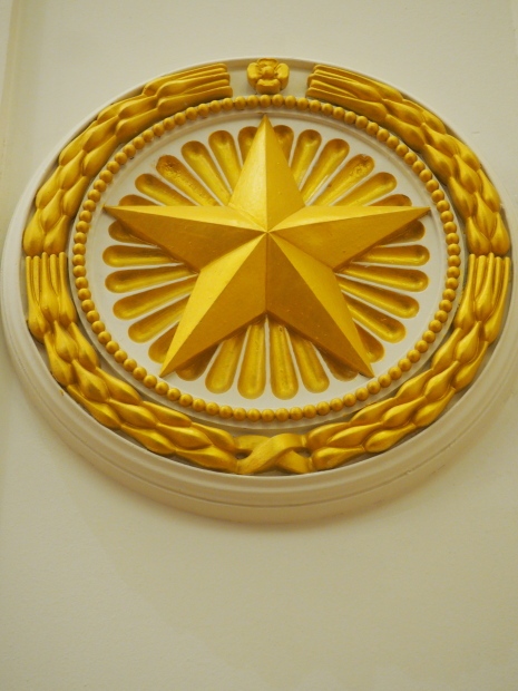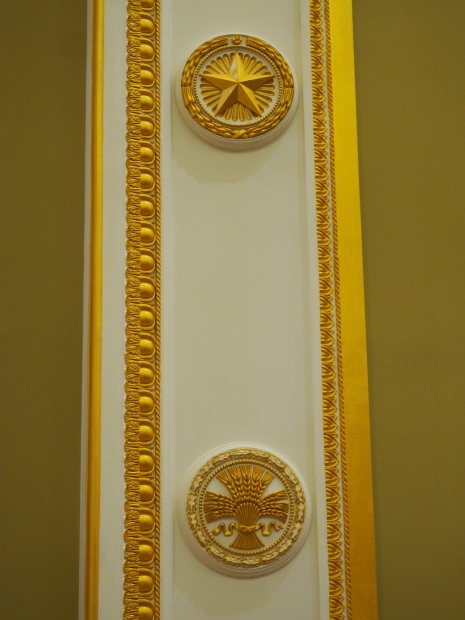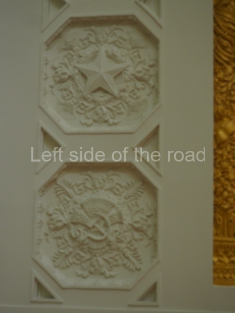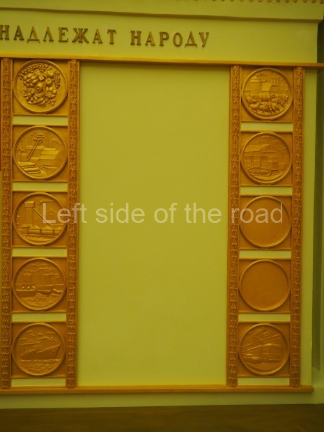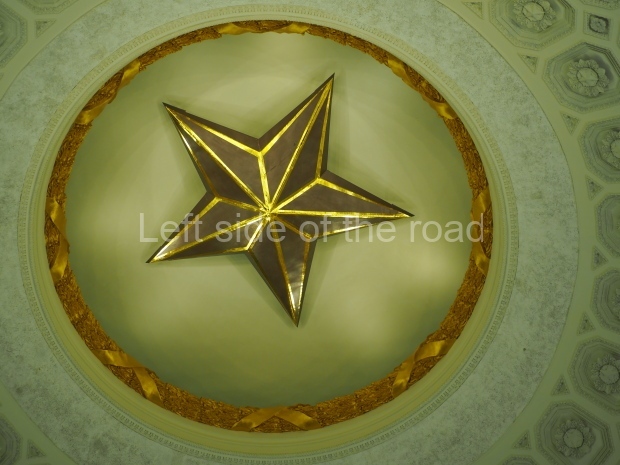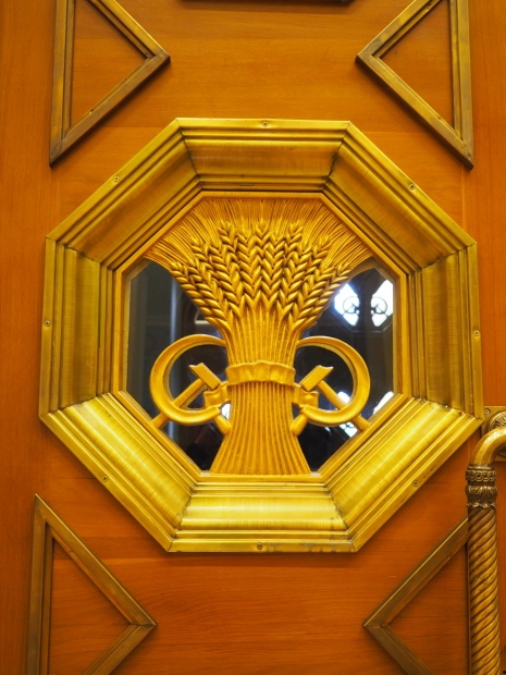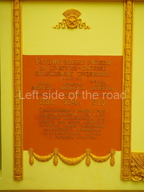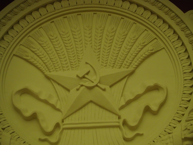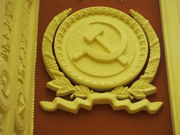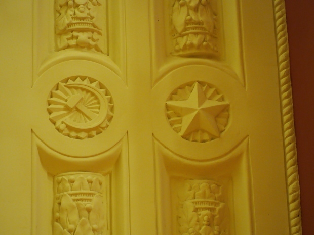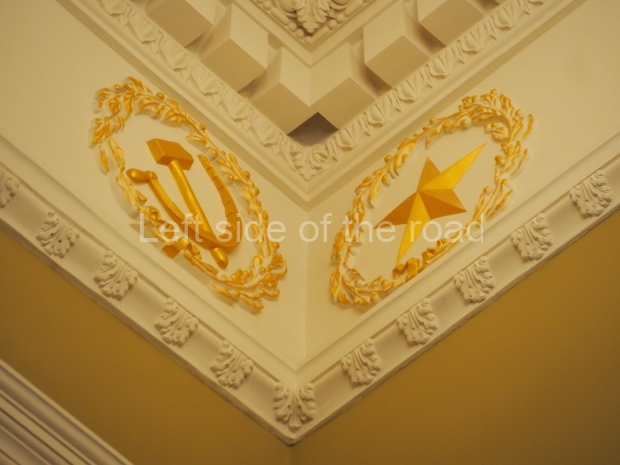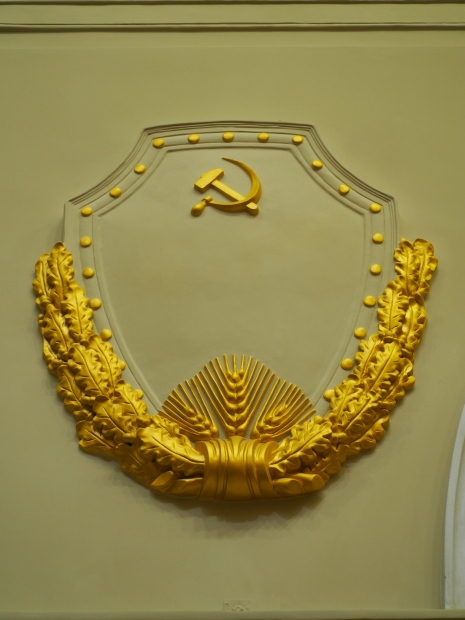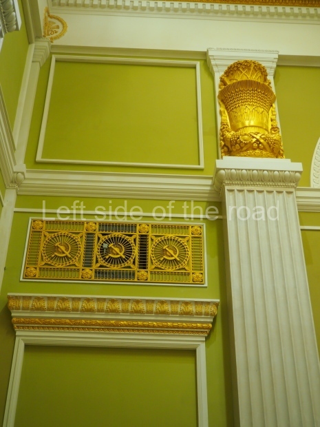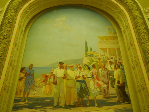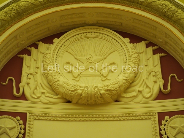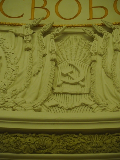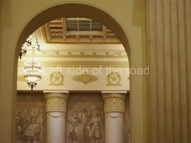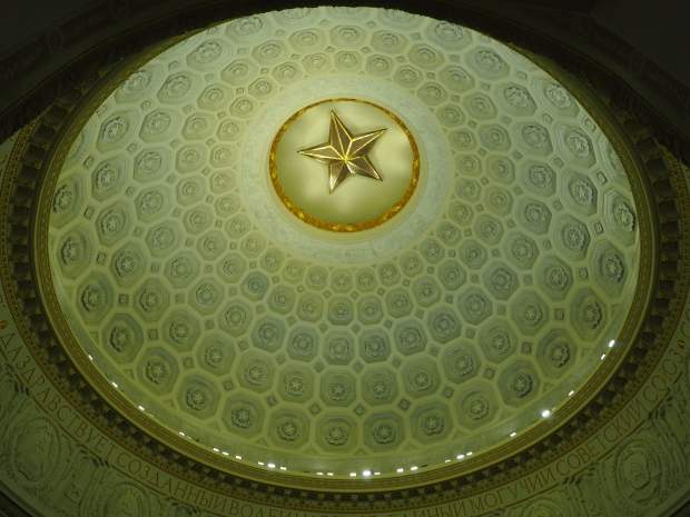 We move to the Stalin’s Constitution Hall made in pastel colors: cream and blue. It has a caisson-embossed dome with a gold star in the middle. The hall is dedicated to the happy future that revolutionaries were fighting for and that is already here.