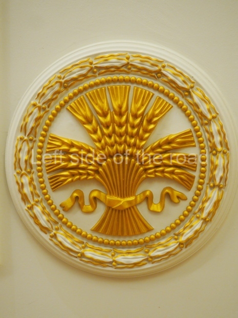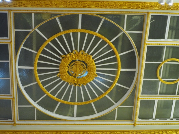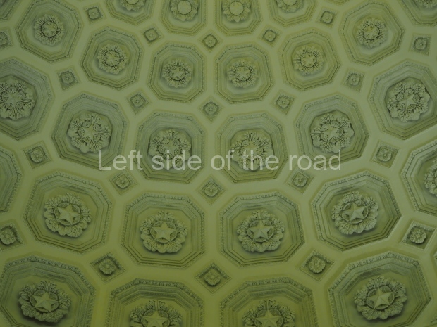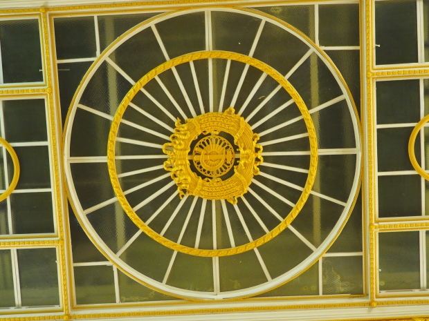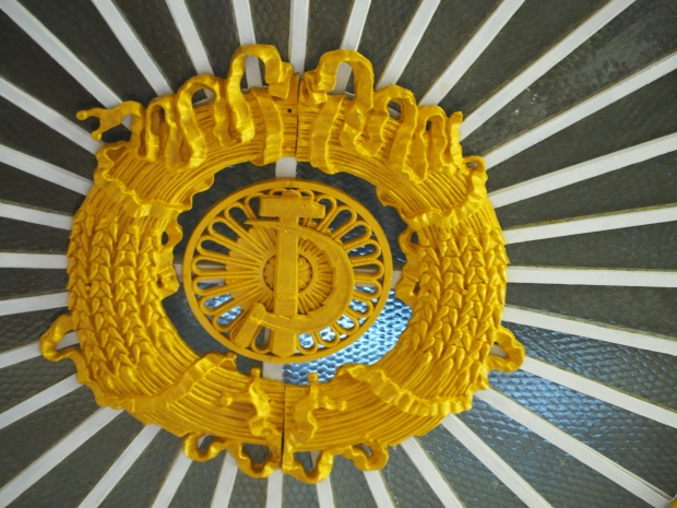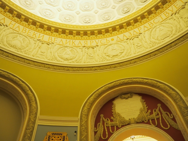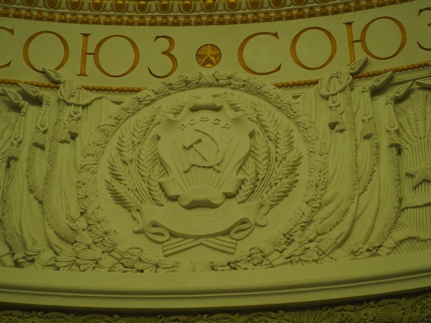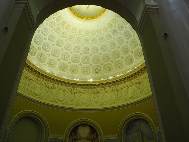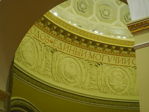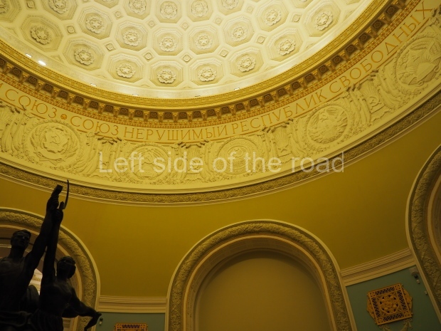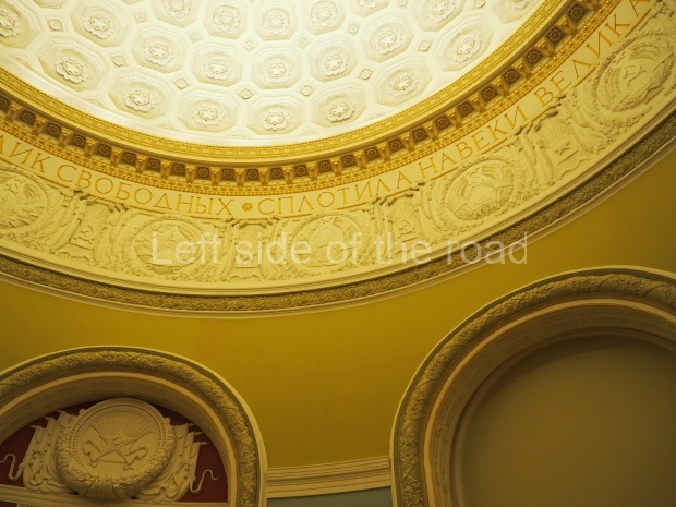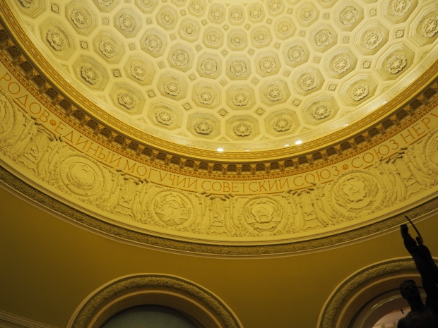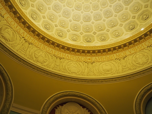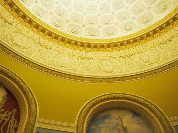 Under the dome, along it circumference, the first lines of the Soviet anthem are written in gold: ‘United forever in friendship and labour, Our mighty republics will ever endure’. Below it are coats of arms of the 16 Soviet republics, including the Karelo-Finnish republic that still existed in 1950s.