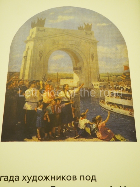 Copies of the two panels that have been lost can be found on information displays. One of them, by Alexander Gerasimov, shows the launch of the Volga-Don canal: Soviet workers greet the first boat passing under the Triumph Arch surrounded by boundless fields that have to be tended and sowed. The other one, by Stepan Kirichenko, is called The Supreme Soviet Deputies in the Kremlin. On it, a crowd of men and women talk solemnly to each other while the background shows Ivan the Great’s bell tower and a Stalin era high-rise: symbols of the past and the present.