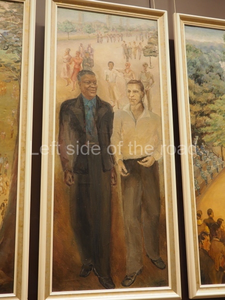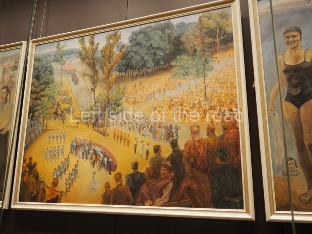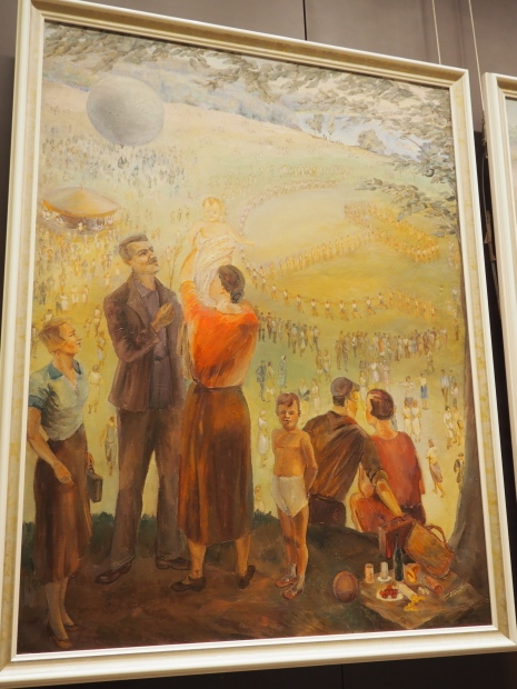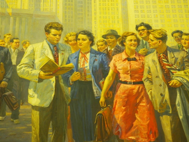 The paintings explain the rights that Stalin’s Constitution of 1936 granted to Soviet citizens. It was considered the most progressive one in the world. It established rights to work, rest, education, etc.