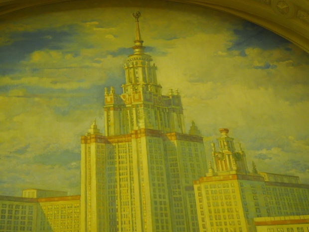 There used to be painted panels depicting happy lives of Soviet citizens at the four sides of the hall. Only two of them survived. The first one, made by artists’ collective led by Alexander Gerasimov, shows students of all nationalities leaving Lomonosov Moscow State University (MSU) at Leninskiye (now Vorobyovy) Gory with books and briefcases and walking as if toward the audience, engaged in lively discussion among themselves. The high-rise University building was finished in 1953, one year before Pavilion No.1 opened to the public, and was instantly captured on the painting. It is like the people on it are alive and about to step down from the wall.
