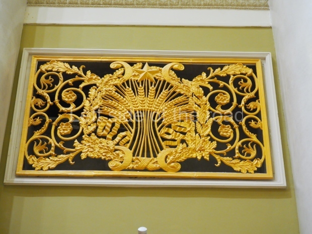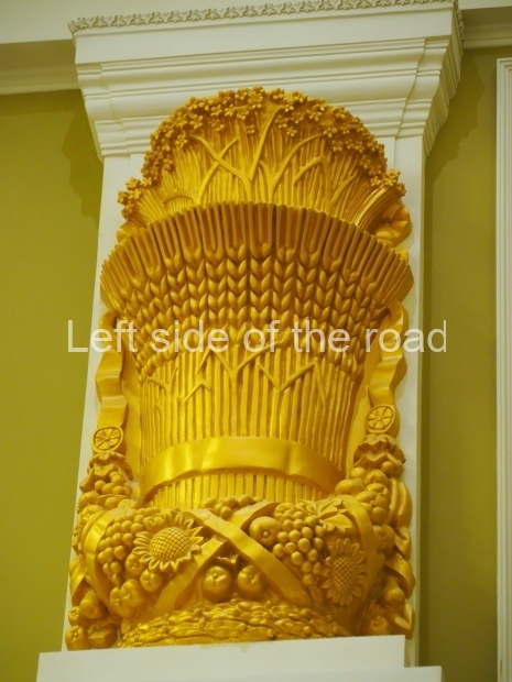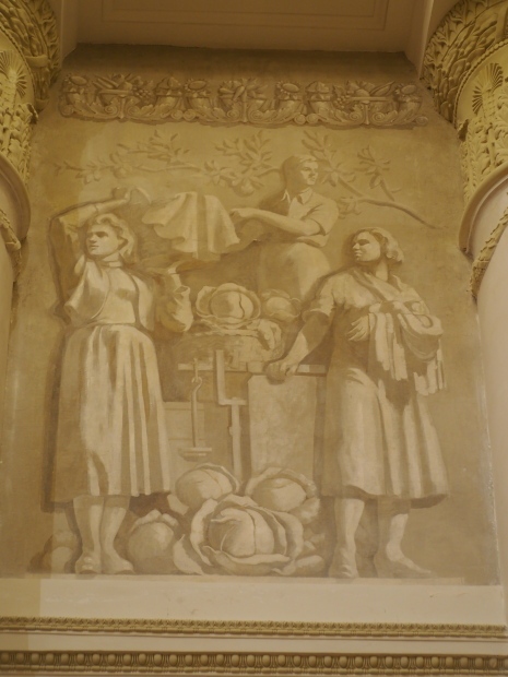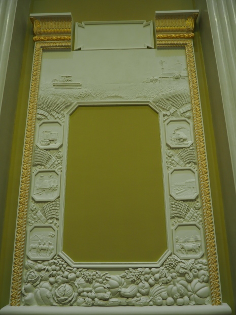 In the hall known as Collective Farms, Soviet Farms — MTS, restoration artists were able to uncover a painting niche framed in creamy-white bas-reliefs: cabbages, corncobs, apples, bunches of grapes, apricots, other vegetables and fruits around the edges with cows, horses and sheep in the middle and farming machinery on top. Such bas-reliefs, probably used to decorate other walls as well, but were lost.