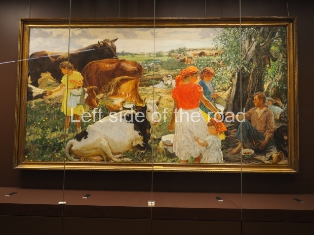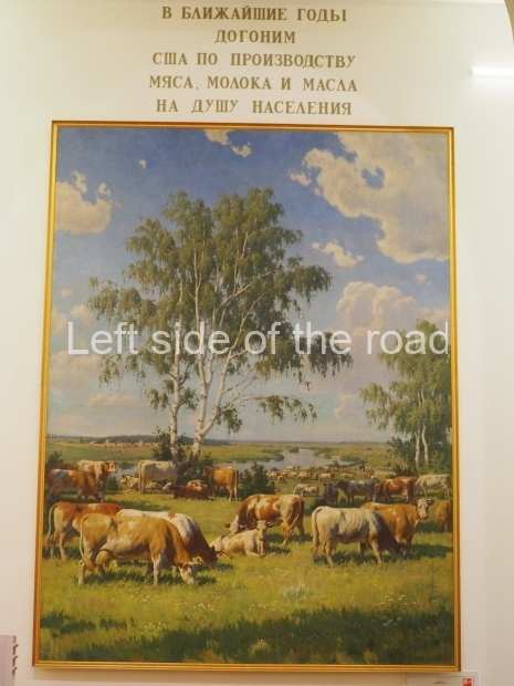 Dairy and Meat Farming in the USSR, a painting by Boris Shcherbakov, returned to that room after being restored. The oil-on-canvas painting depicts a herd of cattle grazing by the river, surrounded by milkmaids and farmers, barns and power lines. On top of it, there is now a recreated slogan that used to be there in 1958: ‘We will catch up to the USA in per capita production of meat, milk and butter in the coming years’.