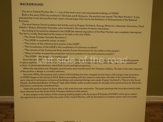 Although it has received a fine renovation it will never be the building as it was designed. The internal decoration, and even the naming of the various halls, was all connected to the success of the October Revolution and the construction of Socialism. That has not been created with the renovation and, in many ways, feels sterile. It is, not as it was originally, a celebration of the achievements of the Soviet people, now just an art gallery providing a few reminders of what once was.