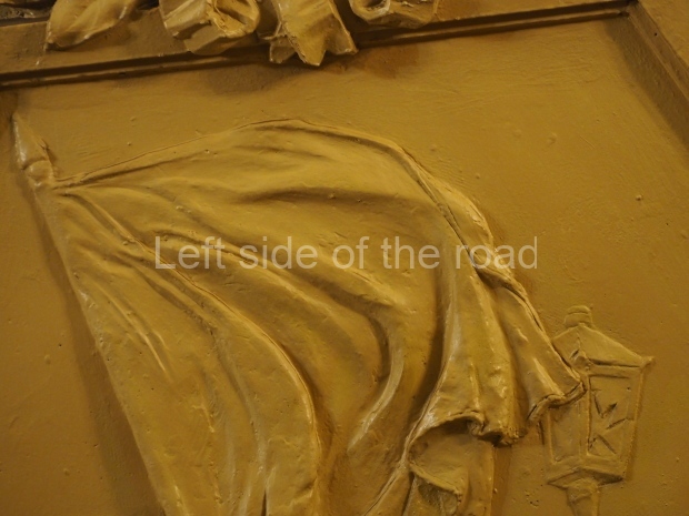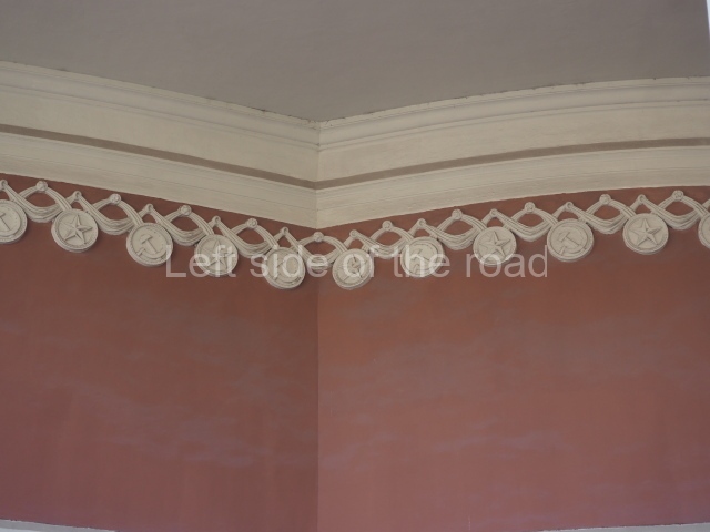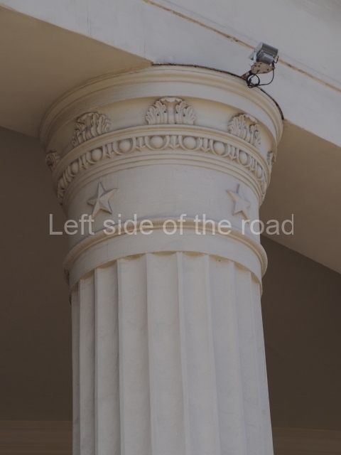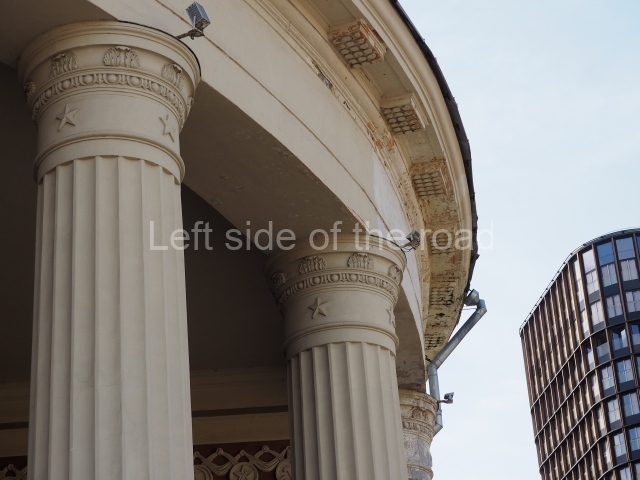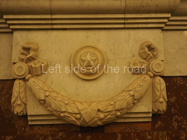 The steel cover of the numerous columns of Mayakovskaya nicknamed the whole station – ‘Mayakovsky’s Steel Jacket’ (analogue of the well-known jacket of the poet). The column edges are adorned up to the human height with strips of rare, good-looking, pink-purple stone with delicate silky glance – Ural rhodonite. It is a decorative stone, i.e. precious and expensive, such as jasper, onyx, agate, or amber. In some places the rhodonite of Mayakovskaya even includes precious materials. Unfortunately, nowadays most unique adornments are lost and replaced with marble of similar colours or painted gypsum patches.