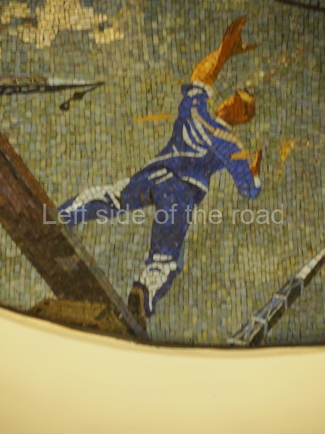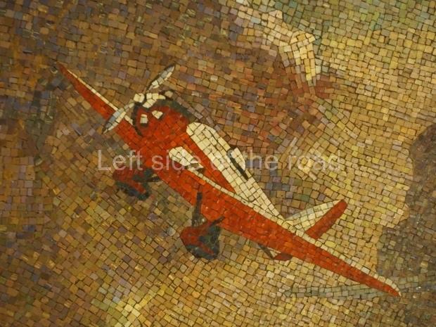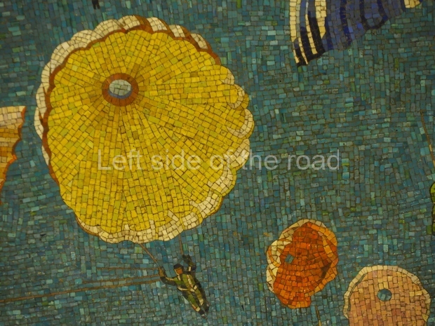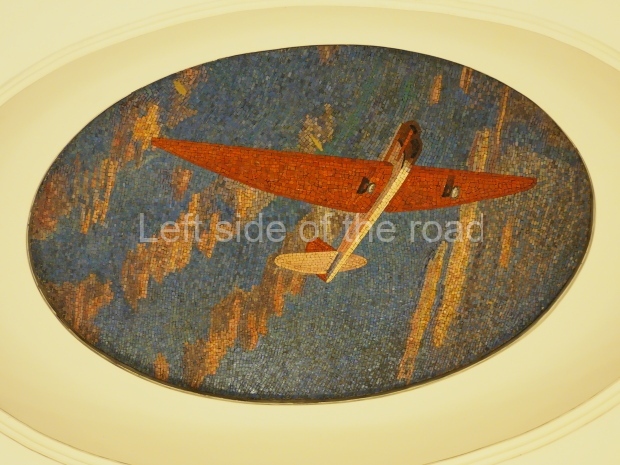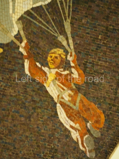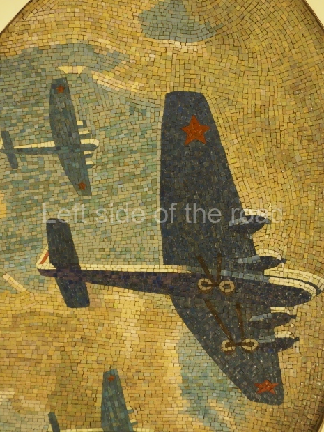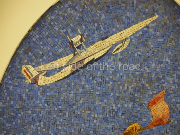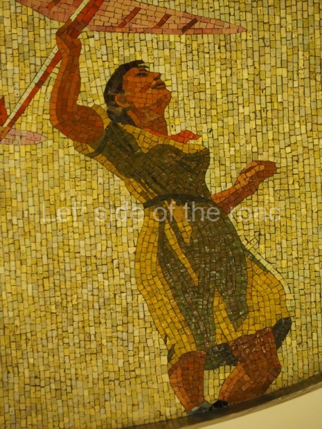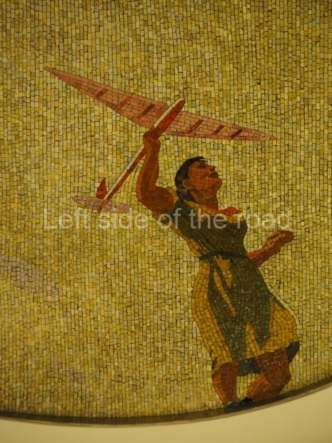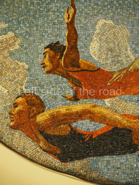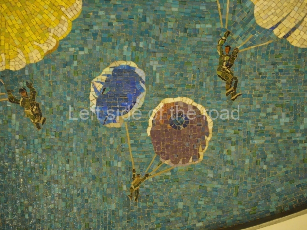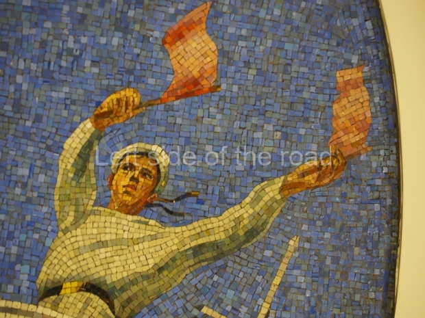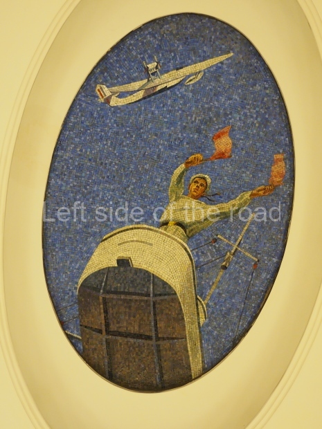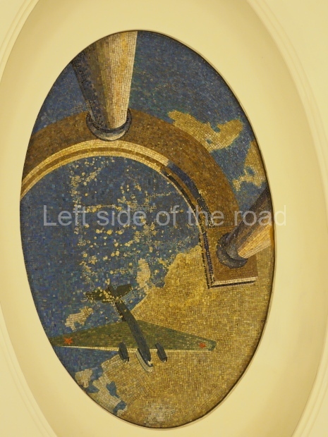 Builders had also much trouble by facing the arches with wide banded stainless steel. There was only one wide-banded shaping mill which could corrugate steel bands of required shape in the USSR at that time. It was located in the town of Direzhablestroy (now Dolgoprudny] where it was planned to manufacture non-rigid Tsiolkovsky’s airships. Airship builders made steel bands of the required shape in time and assembled them on the arcades of Mayakovskaya. So 35 hip-roof sections appeared in the central hall of the station. They are divided by ribs radiating from the columns caps. The sections grow from two opposite columns. They are oval and extend crosswise the hall. The central part of each section has an additional oval deepening with a flat bottom. There are mosaic medallions depicting ‘A Day of the Soviet country’ (made by V. Frolov by the cartoons of A. Deineka). They are sequenced to evoke a day. Coming from the escalator passengers see early morning, cherry-trees in blossom, and two planes in the sky. The next panel – divers plunge into water head first on the background of the sky. Next – ripe peaches, signalman on a ship mast and a seaplane, parachutist, and avia-parade. In this medallion the clock of the Spasskaya Tower shows noon. The morning has ended. The afternoon has started. The first afternoon panel shows a girl driving a combine harvester. Grains are in the ear. Wind blows about red flags. The second one – a pole-vaulter clearing a crossbar. Next – three gliders in the sky, four parachutists with many-coloured parachutes and a plane flying away, ski jumping, brazen reflection of sunset on pines and a flying plane, sculpture ‘A Girl with an Oar’ in Gorky Park, a red plane in the sunset sky. Here the night starts. The first night panel shows two planes on the background on sunset clouds. Then, the planes but at night. The plane lights are switched on. Next – an airship over the Spasskaya Tower (the clock shows midnight), night parachute jump, a biplane in searchlight, two planes in false dawn. Early morning. Fuming chimneys and tail cones of chemical mills. Beyond the chimneys – a stratoplane starts, pioneers launch air models, three guys play volleyball, morning parachute jump, airplane flies above semicircle colonnade, a steeplejack takes load, seagulls are above a ship with a flag, a woman with an infant in arms, two red airplanes, a plane above a transmission line pole, sunflowers. Two last medallions are closed now because the second exit is under construction. Going from panel to panel, plunging by perception in imaginary pictures, which, like Byzantium mosaics, pull a person out of the objective reality, a passenger seems to appear in the mysterious world. Lamps fixed by the outline of the internal ovals illuminate the mosaic medallions as well as the station itself.