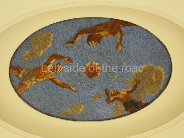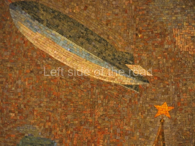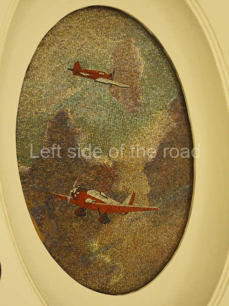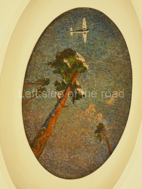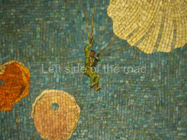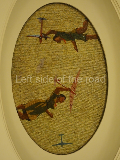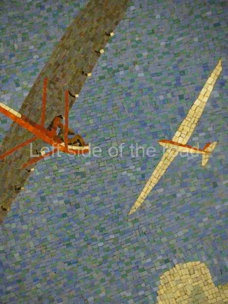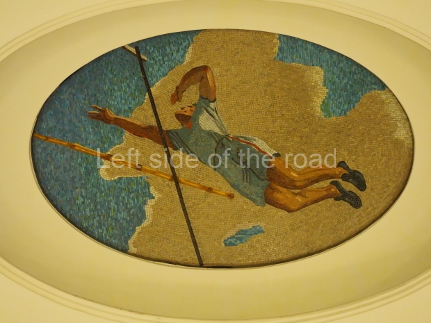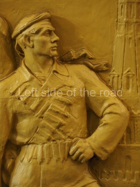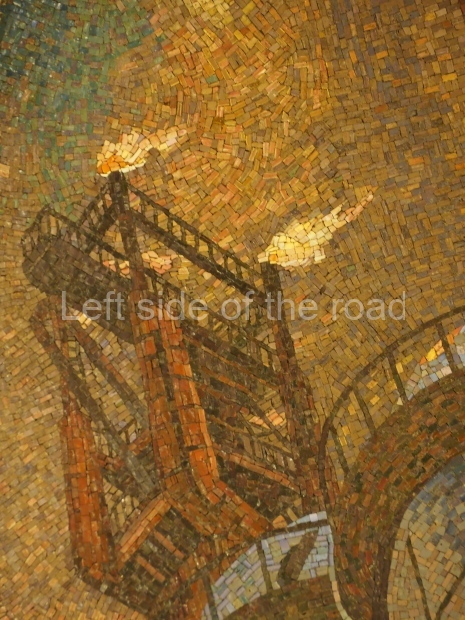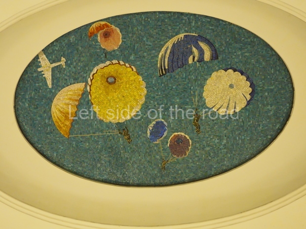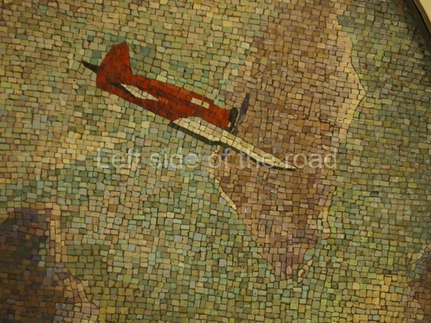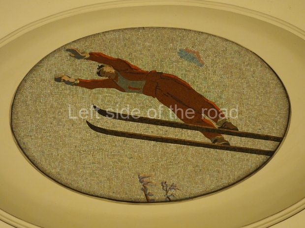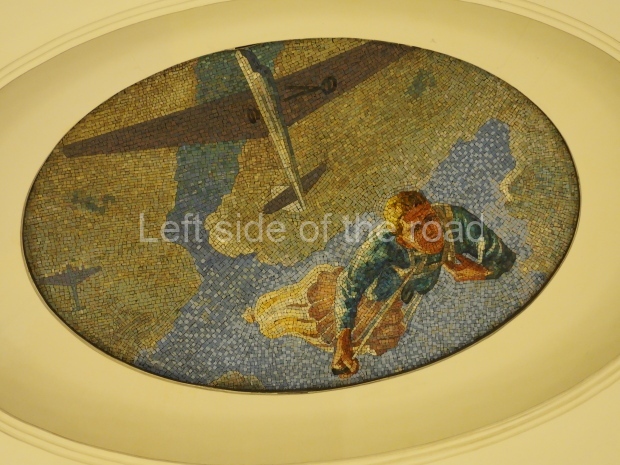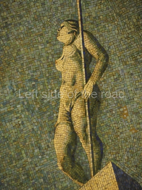 Builders had also much trouble by facing the arches with wide banded stainless steel. There was only one wide-banded shaping mill which could corrugate steel bands of required shape in the USSR at that time. It was located in the town of Direzhablestroy (now Dolgoprudny] where it was planned to manufacture non-rigid Tsiolkovsky’s airships. Airship builders made steel bands of the required shape in time and assembled them on the arcades of Mayakovskaya. So 35 hip-roof sections appeared in the central hall of the station. They are divided by ribs radiating from the columns caps. The sections grow from two opposite columns. They are oval and extend crosswise the hall. The central part of each section has an additional oval deepening with a flat bottom. There are mosaic medallions depicting ‘A Day of the Soviet country’ (made by V. Frolov by the cartoons of A. Deineka). They are sequenced to evoke a day. Coming from the escalator passengers see early morning, cherry-trees in blossom, and two planes in the sky. The next panel – divers plunge into water head first on the background of the sky. Next – ripe peaches, signalman on a ship mast and a seaplane, parachutist, and avia-parade. In this medallion the clock of the Spasskaya Tower shows noon. The morning has ended. The afternoon has started. The first afternoon panel shows a girl driving a combine harvester. Grains are in the ear. Wind blows about red flags. The second one – a pole-vaulter clearing a crossbar. Next – three gliders in the sky, four parachutists with many-coloured parachutes and a plane flying away, ski jumping, brazen reflection of sunset on pines and a flying plane, sculpture ‘A Girl with an Oar’ in Gorky Park, a red plane in the sunset sky. Here the night starts. The first night panel shows two planes on the background on sunset clouds. Then, the planes but at night. The plane lights are switched on. Next – an airship over the Spasskaya Tower (the clock shows midnight), night parachute jump, a biplane in searchlight, two planes in false dawn. Early morning. Fuming chimneys and tail cones of chemical mills. Beyond the chimneys – a stratoplane starts, pioneers launch air models, three guys play volleyball, morning parachute jump, airplane flies above semicircle colonnade, a steeplejack takes load, seagulls are above a ship with a flag, a woman with an infant in arms, two red airplanes, a plane above a transmission line pole, sunflowers. Two last medallions are closed now because the second exit is under construction. Going from panel to panel, plunging by perception in imaginary pictures, which, like Byzantium mosaics, pull a person out of the objective reality, a passenger seems to appear in the mysterious world. Lamps fixed by the outline of the internal ovals illuminate the mosaic medallions as well as the station itself.