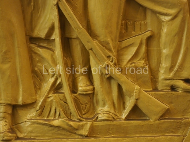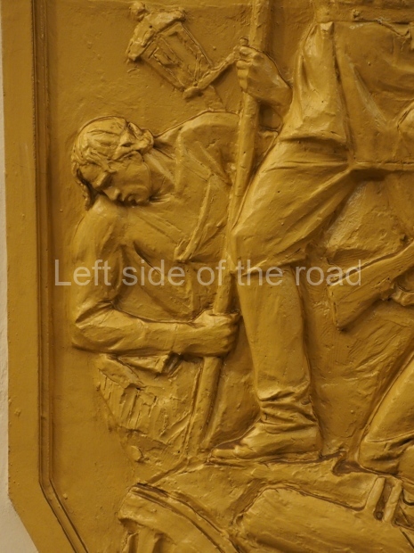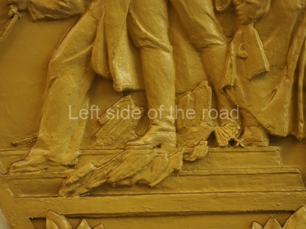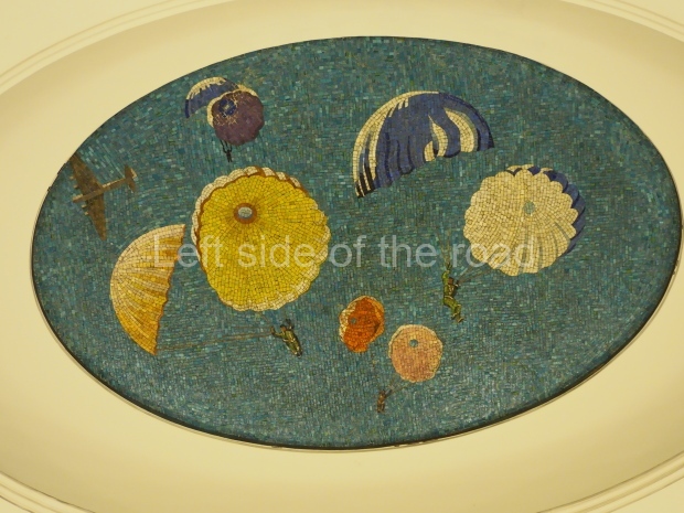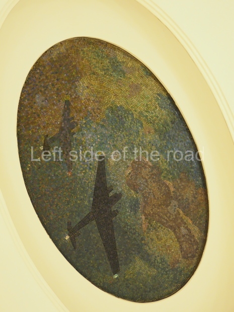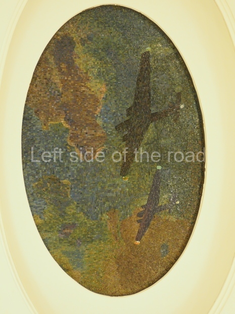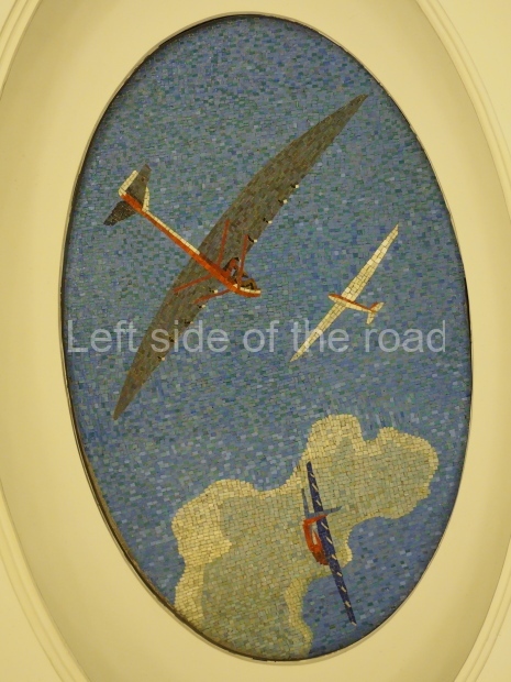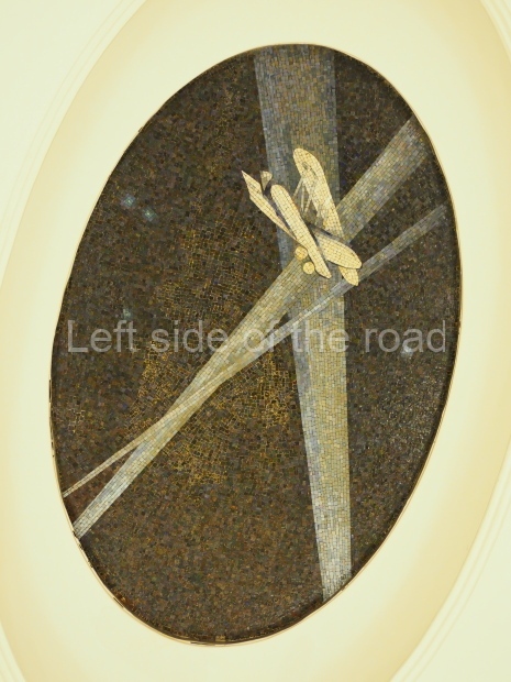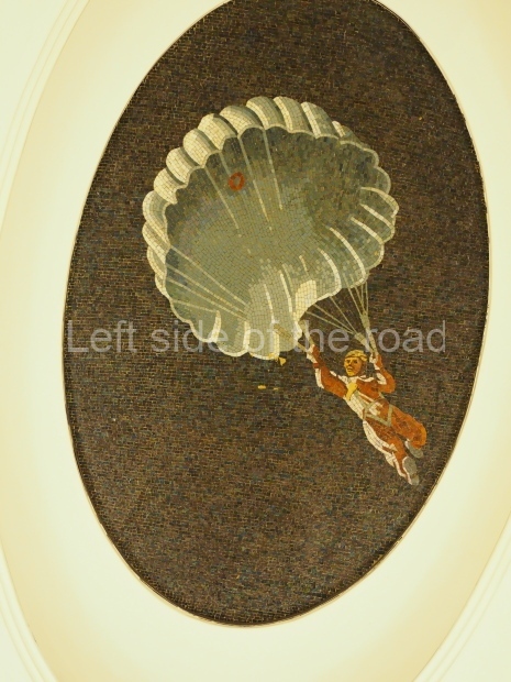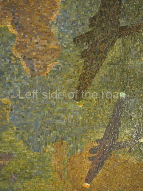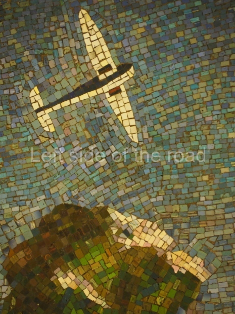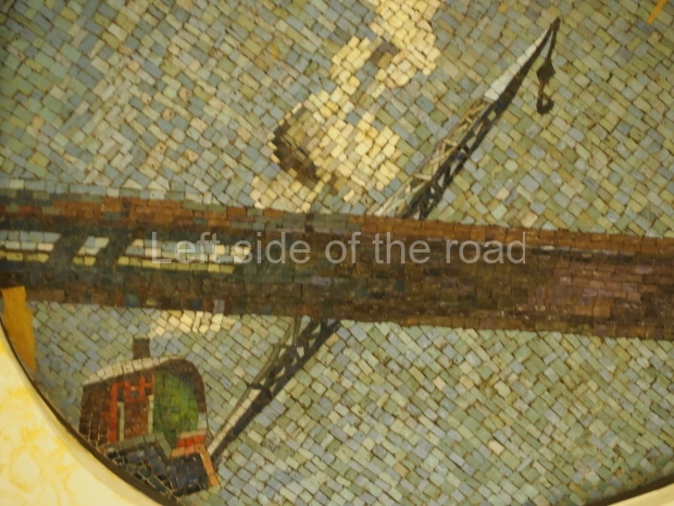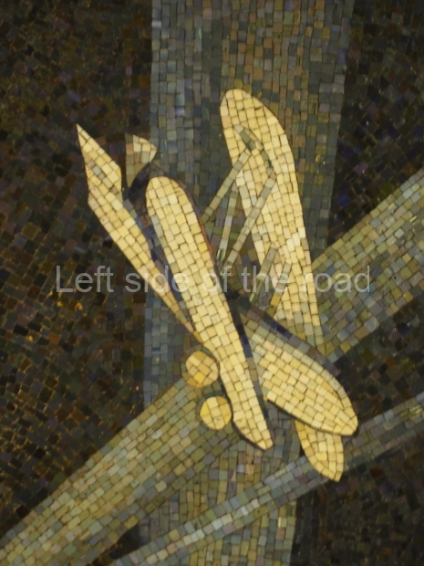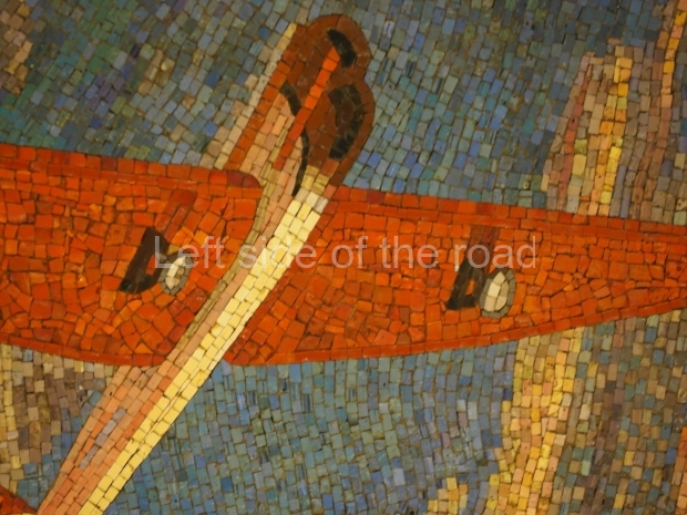 Builders had also much trouble by facing the arches with wide banded stainless steel. There was only one wide-banded shaping mill which could corrugate steel bands of required shape in the USSR at that time. It was located in the town of Direzhablestroy (now Dolgoprudny] where it was planned to manufacture non-rigid Tsiolkovsky’s airships. Airship builders made steel bands of the required shape in time and assembled them on the arcades of Mayakovskaya. So 35 hip-roof sections appeared in the central hall of the station. They are divided by ribs radiating from the columns caps. The sections grow from two opposite columns. They are oval and extend crosswise the hall. The central part of each section has an additional oval deepening with a flat bottom. There are mosaic medallions depicting ‘A Day of the Soviet country’ (made by V. Frolov by the cartoons of A. Deineka). They are sequenced to evoke a day. Coming from the escalator passengers see early morning, cherry-trees in blossom, and two planes in the sky. The next panel – divers plunge into water head first on the background of the sky. Next – ripe peaches, signalman on a ship mast and a seaplane, parachutist, and avia-parade. In this medallion the clock of the Spasskaya Tower shows noon. The morning has ended. The afternoon has started. The first afternoon panel shows a girl driving a combine harvester. Grains are in the ear. Wind blows about red flags. The second one – a pole-vaulter clearing a crossbar. Next – three gliders in the sky, four parachutists with many-coloured parachutes and a plane flying away, ski jumping, brazen reflection of sunset on pines and a flying plane, sculpture ‘A Girl with an Oar’ in Gorky Park, a red plane in the sunset sky. Here the night starts. The first night panel shows two planes on the background on sunset clouds. Then, the planes but at night. The plane lights are switched on. Next – an airship over the Spasskaya Tower (the clock shows midnight), night parachute jump, a biplane in searchlight, two planes in false dawn. Early morning. Fuming chimneys and tail cones of chemical mills. Beyond the chimneys – a stratoplane starts, pioneers launch air models, three guys play volleyball, morning parachute jump, airplane flies above semicircle colonnade, a steeplejack takes load, seagulls are above a ship with a flag, a woman with an infant in arms, two red airplanes, a plane above a transmission line pole, sunflowers. Two last medallions are closed now because the second exit is under construction. Going from panel to panel, plunging by perception in imaginary pictures, which, like Byzantium mosaics, pull a person out of the objective reality, a passenger seems to appear in the mysterious world. Lamps fixed by the outline of the internal ovals illuminate the mosaic medallions as well as the station itself.