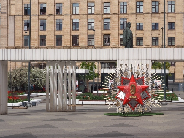 The walls below are faced with red marble with intricate white impregnations. It is from the Georgian Saliety Deposit. Above the walls are decorated with grey-white-bluish Ural marble from the Ufaleyskoye Deposit.The floor of the station is covered with white, yellow, and sugar-like marble from the Uzbek Gazgan Deposit, which is famous of its abrasion resistance, with decorative inserts of pink and grey granite and narrow strips of black diabase.