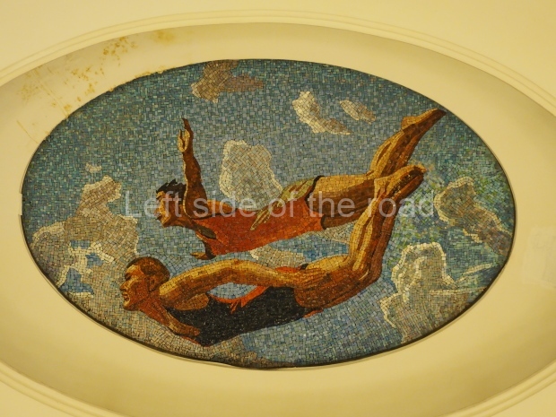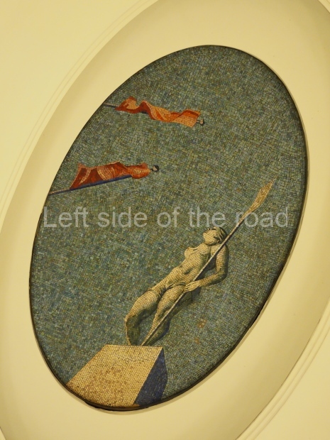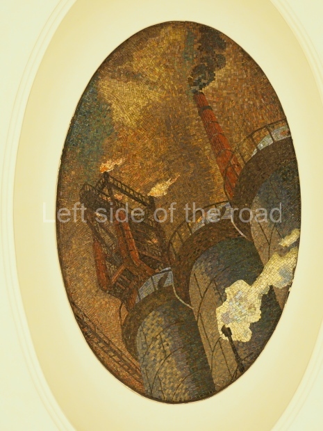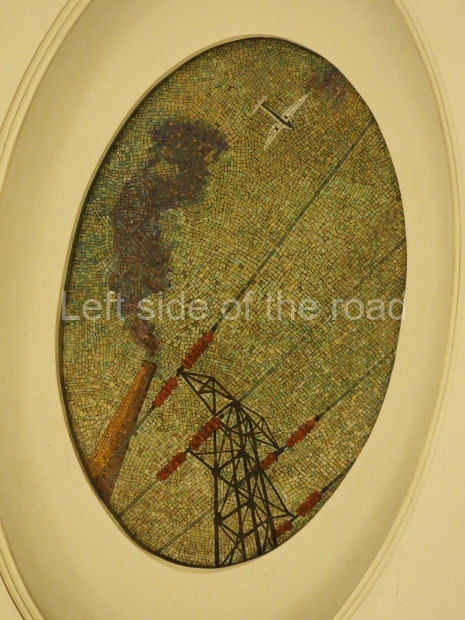 Alexey Dushkin’s Art Deco architecture was based on a Soviet future as envisioned by the poet Mayakovsky. The station features streamlined columns faced with stainless steel and pink rhodonite, white Ufaley and grey Diorite marble walls, a flooring pattern of white and pink marble, and 35 niches, one for each vault. Surrounded by filament lights there are a total of 34 ceiling mosaics by Alexander Deyneka with the theme ’24-Hour Soviet Sky’.