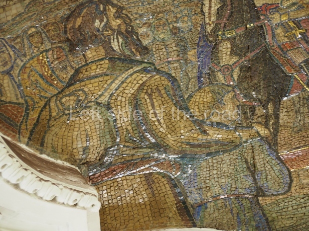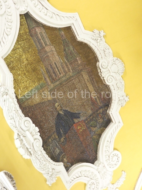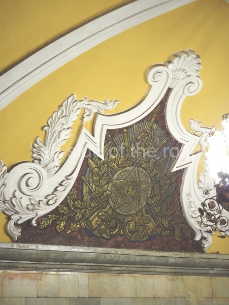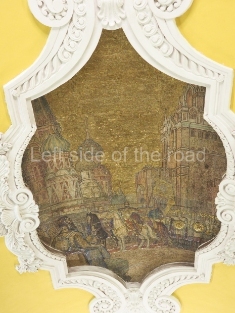 Bykova and Taranov used the geometrical picture of the Roman Tomb of the Valeries as a model for decorating the vault of station (adopted by Zholtovsky) but placed six smalt mosaics along its main axis. They were designed by A. Deineka and made by Leningrad craftsman V. Frolov. After his death during the siege of Leningrad, the panels were brought from the city by the Road of Life. The mosaics present absolutely peaceful scenes on the background of the blue sky (only one panel has no sky at all). The first one, starting from the northern end, shows girls harvesting peaches. The second – foundry. The third – workers moving a tractor by an assembly line. It is interesting that the lamps in the panel are similar to those used in the first metro lines and that the ceiling of the workshop is made of glass. The forth panel – builders. The fifth – a pilot takes his place in an airplane. The last panel has the most dynamic scene. Early morning. A girl-skier looks at a blue steam locomotive running by a viaduct and a pink airplane flying in the sky.