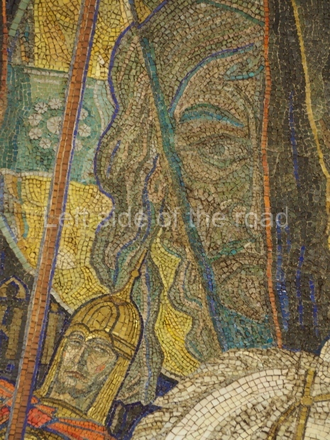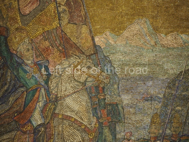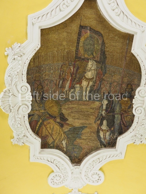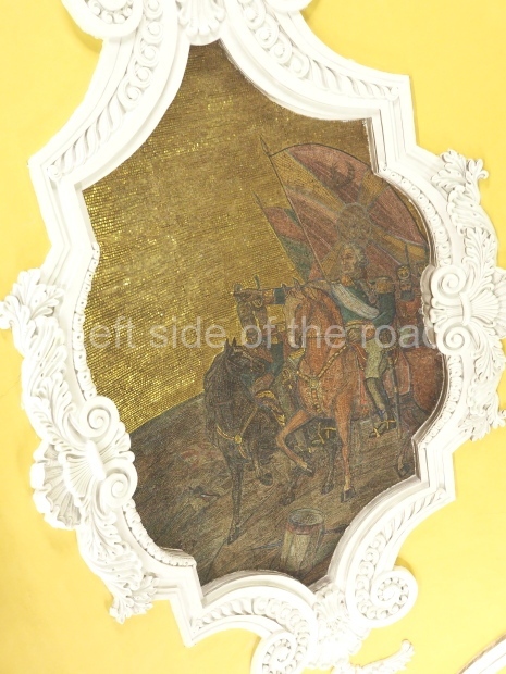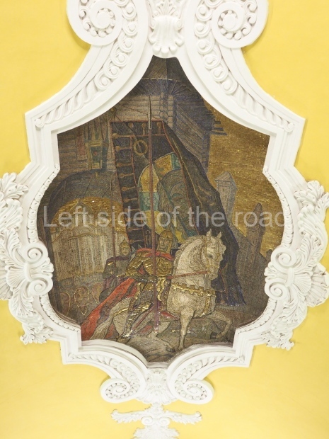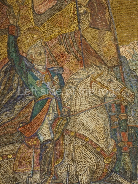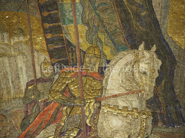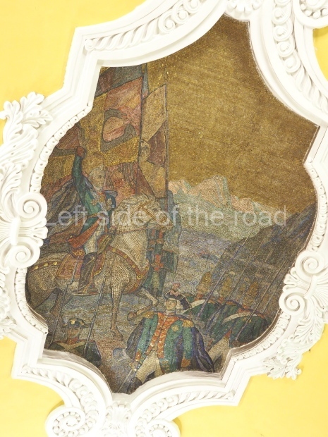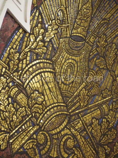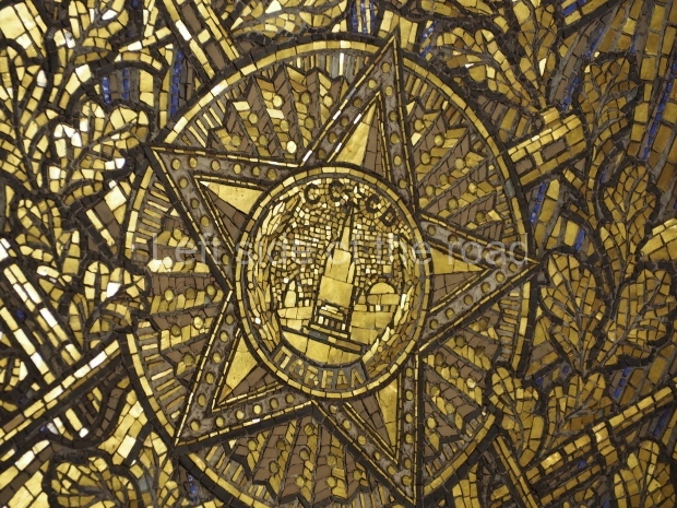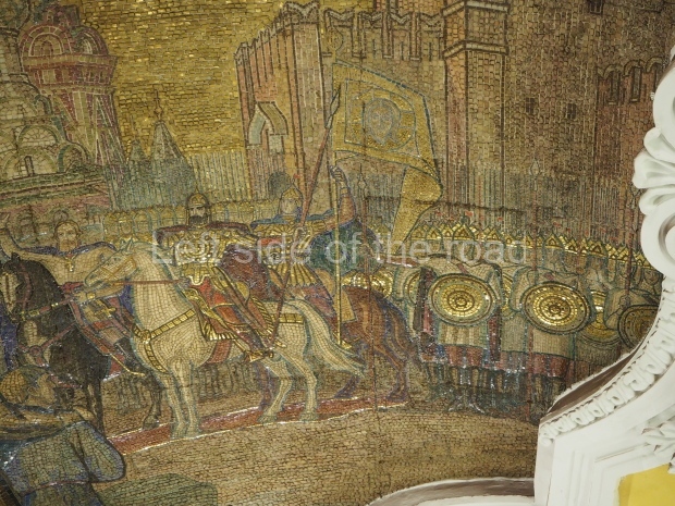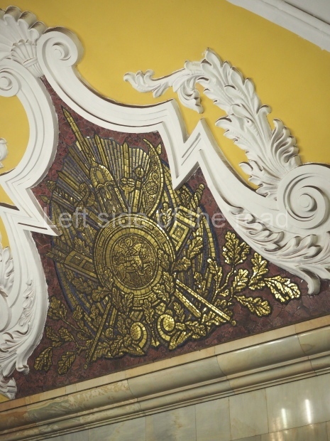 There are metal shields above each bench on the side of the central hall rounded with banners and legends ‘Glory to Heroic Defenders of Leningrad’, ‘… Sevastopol , ‘… Odessa’, ‘… Stalingrad’. On the platform sides the shields have the profiles of great Russian military commanders: Alexander Nevsky, Michael Kutuzov, Alexander Suvorov, Minin and Pozharsky, Dmitry Donskoy. The gypsum frieze runs through the whole central hall between the pylons and the vault with figures of soldiers and officers of different forces of the Red Army. There are signalmen, pilots, tank men, infantrymen, marines, and cavalrymen. They all either plan operations or attack and no one retreats. The sculpture groups are separated with Orders of the Great Patriotic War. There is a shield wording ‘Glory to Brave Soldiers of the Great Patriotic War’ above the exit to the city.