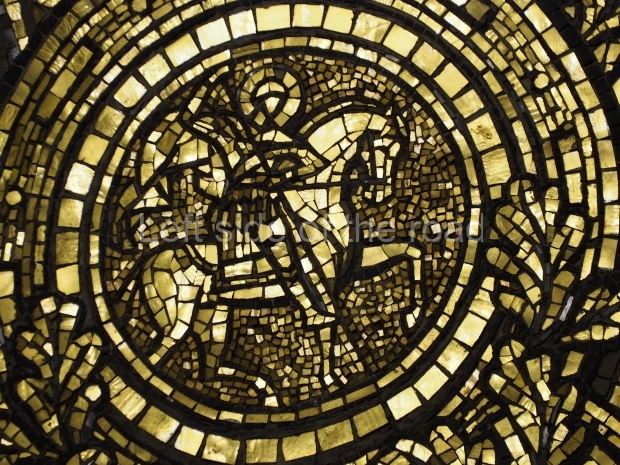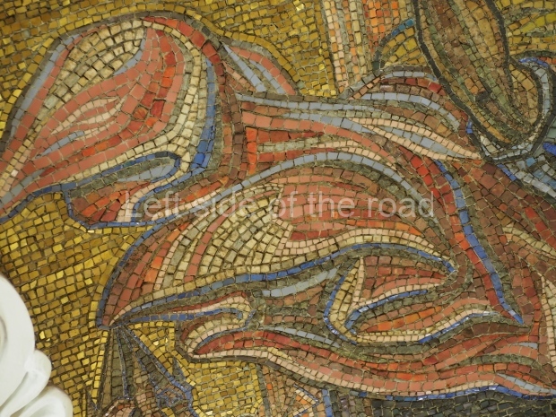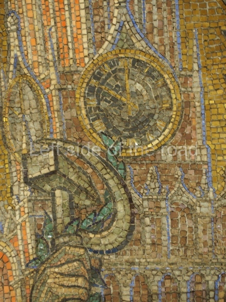 All the mosaics are illuminated by the torchieres placed along the main axis of the central hall. Till 2005 the shades and lamps were not bright, so the station seemed dark and the panels were poorly seen. Now it is the past, so one, sitting on a bench, can admire the sky through upward ‘windows’. The idea to establish such lamps was also supported by Zholtovsky. Various stones were used for the decoration of the station, pylons, walls, and floors. The old part of the station was faced white, yellowish, and ivory-coloured marble of the Prokhorovsko-Balandinskoye Deposit (Sverdlovskaya Oblast).