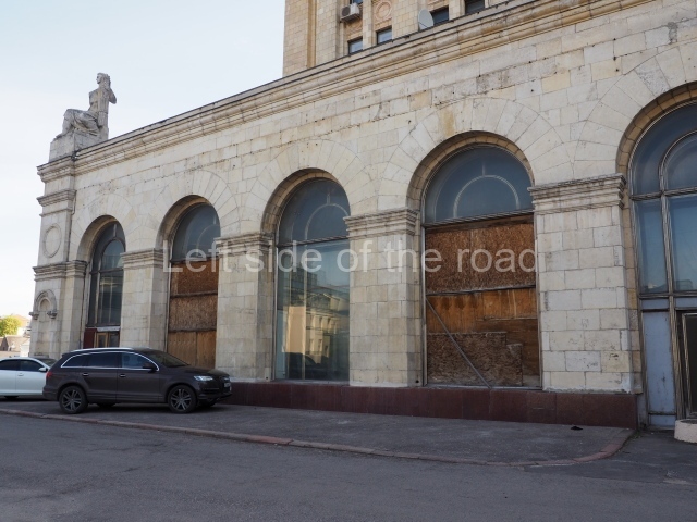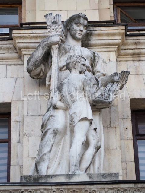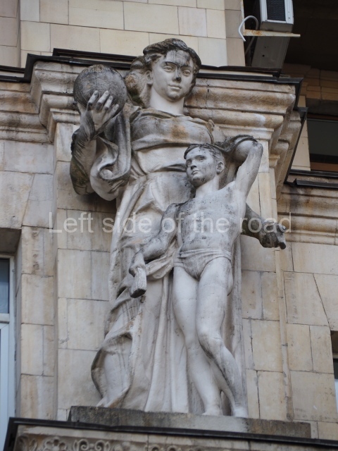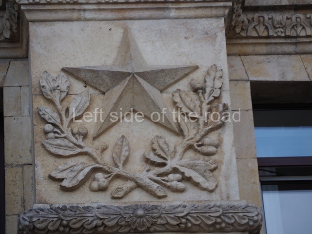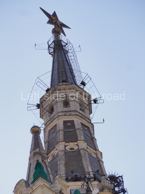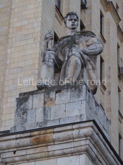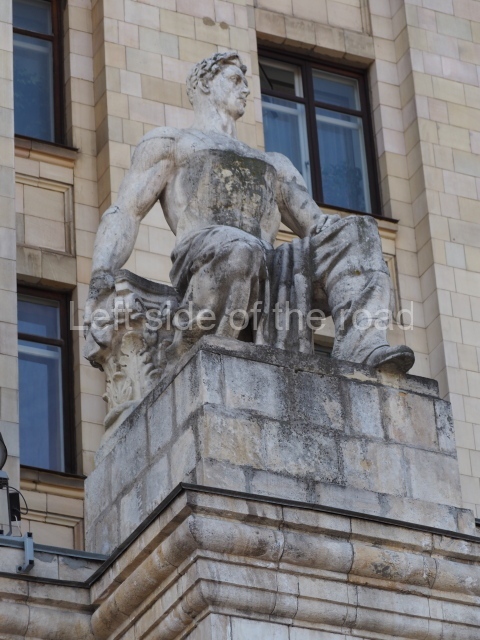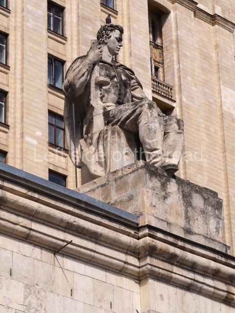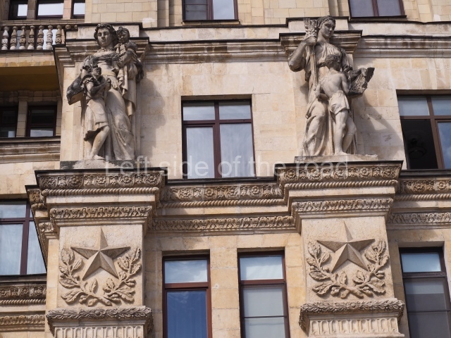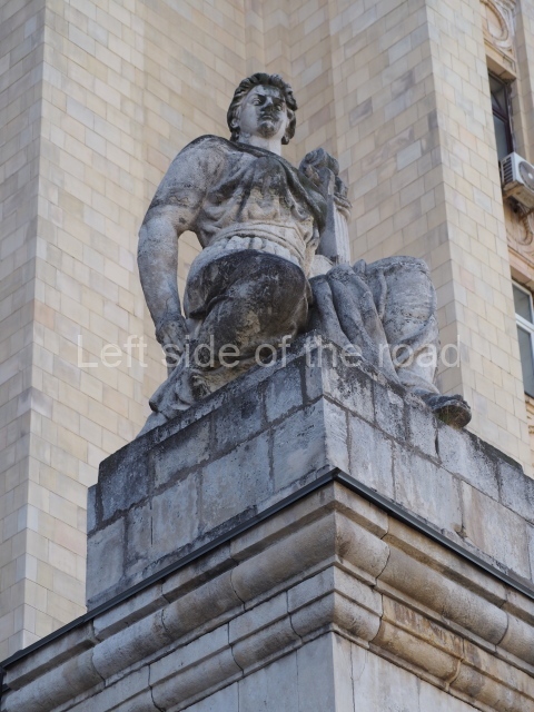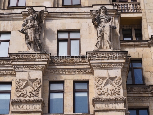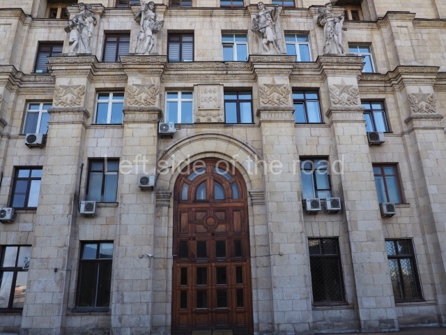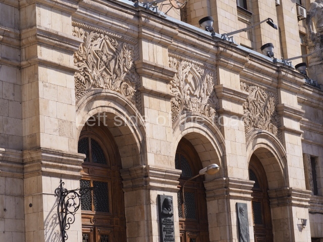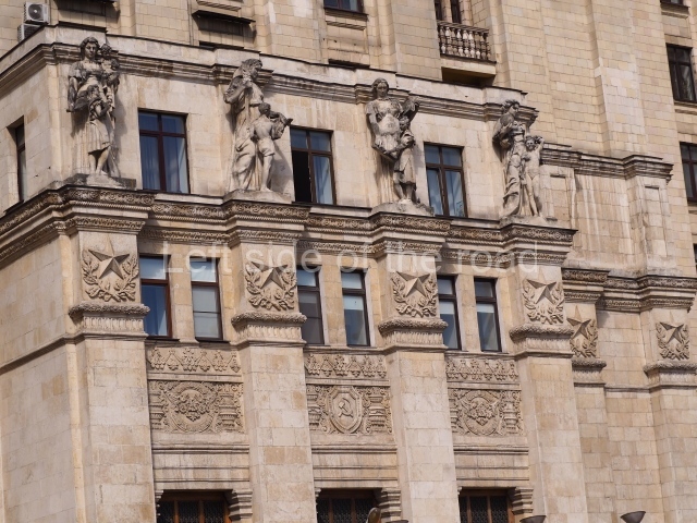 The building was richly decorated but lacked a unified stylistic direction. The parapets are in the ancient Roman style. The lobbies decorated with marble columns, stained-glass windows, and lamps in the form of candelabra are a reminiscence of Gothic interiors. The pointed turrets around the spire resemble the domes of an Eastern Orthodox church. On the roof of the stylobate, there are sculptural portraits of Soviet workers and soldiers.