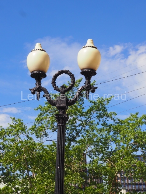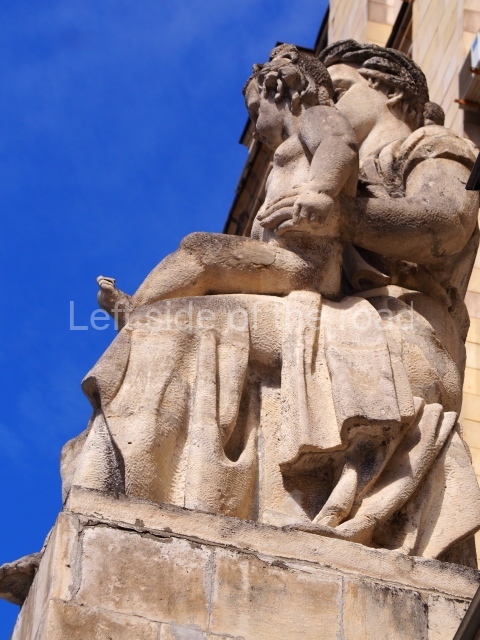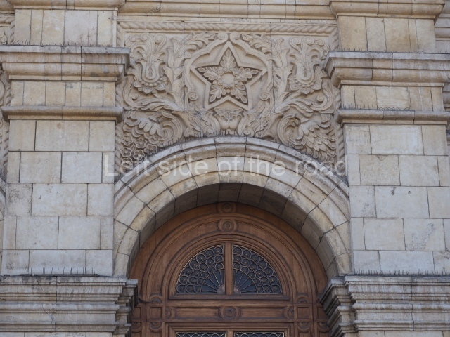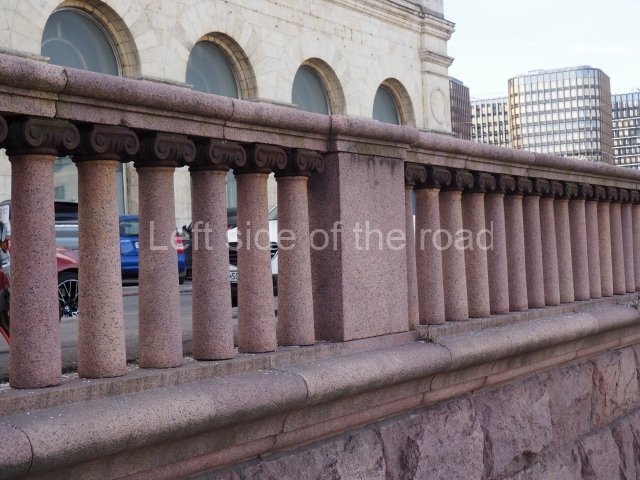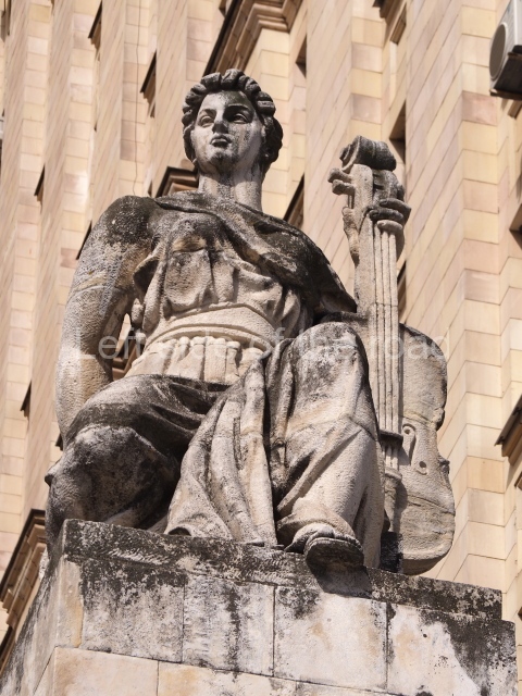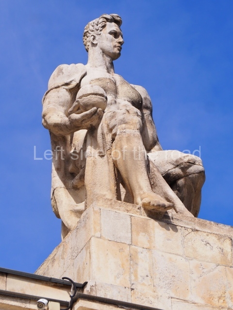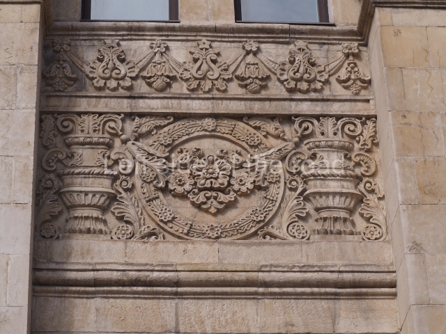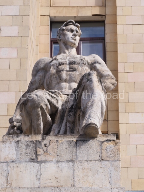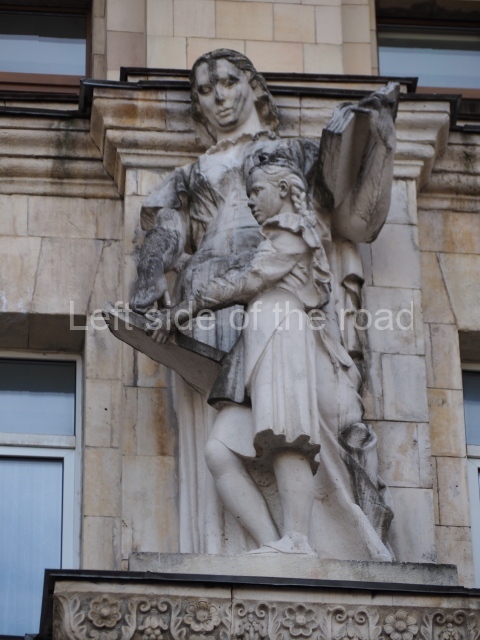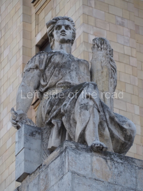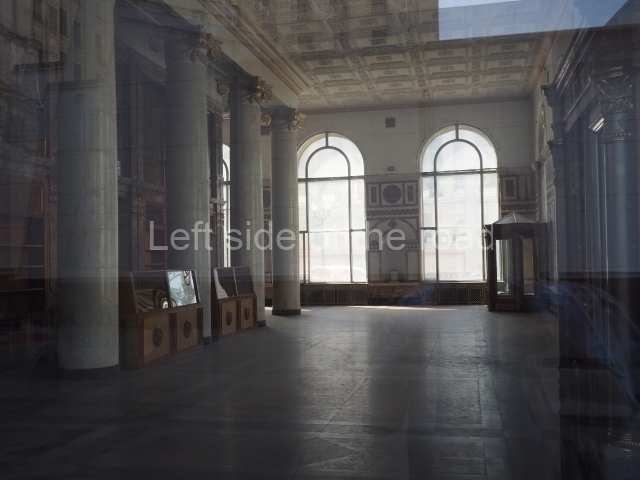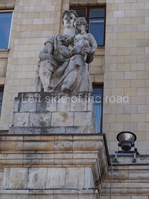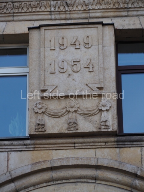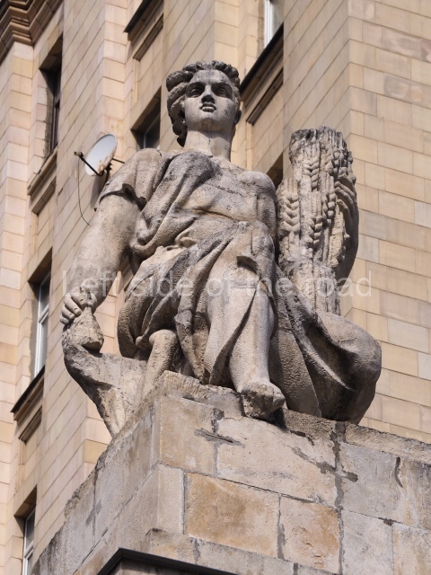 The building was richly decorated but lacked a unified stylistic direction. The parapets are in the ancient Roman style. The lobbies decorated with marble columns, stained-glass windows, and lamps in the form of candelabra are a reminiscence of Gothic interiors. The pointed turrets around the spire resemble the domes of an Eastern Orthodox church. On the roof of the stylobate, there are sculptural portraits of Soviet workers and soldiers.