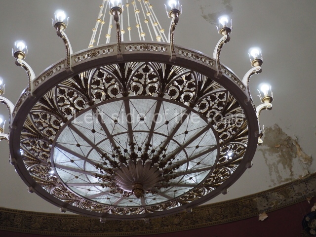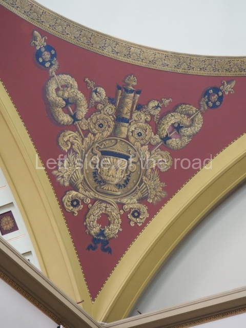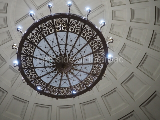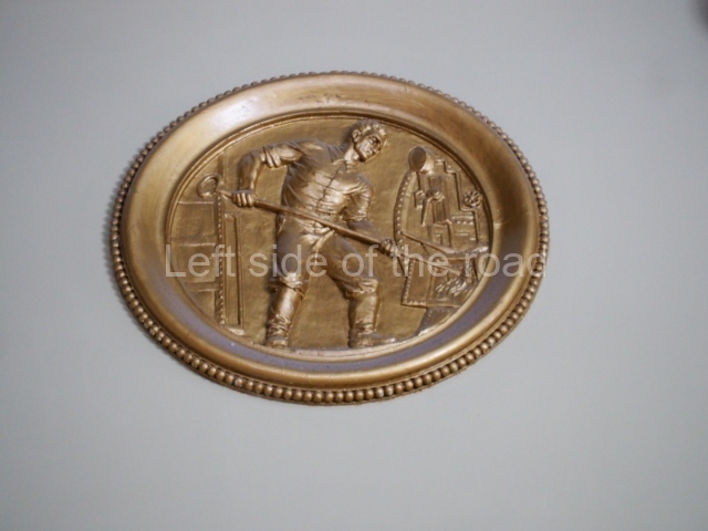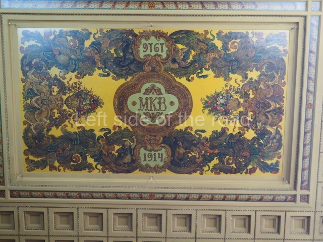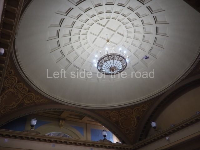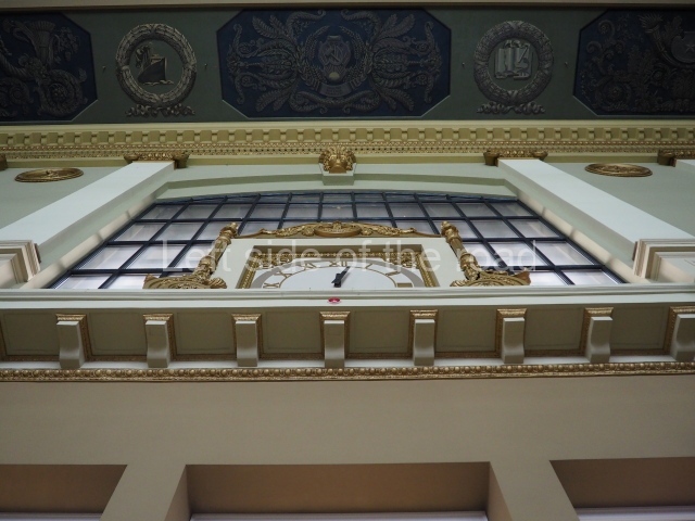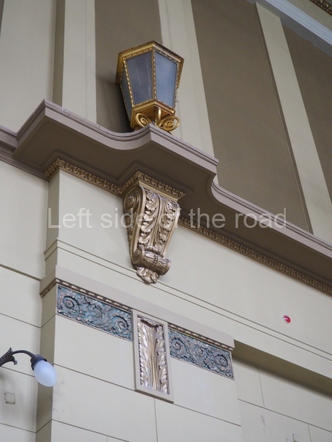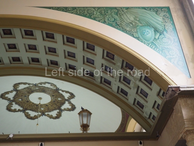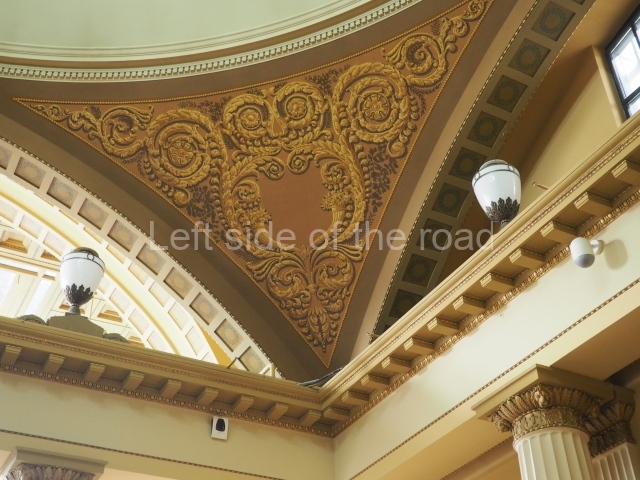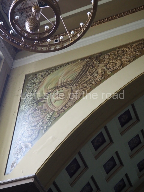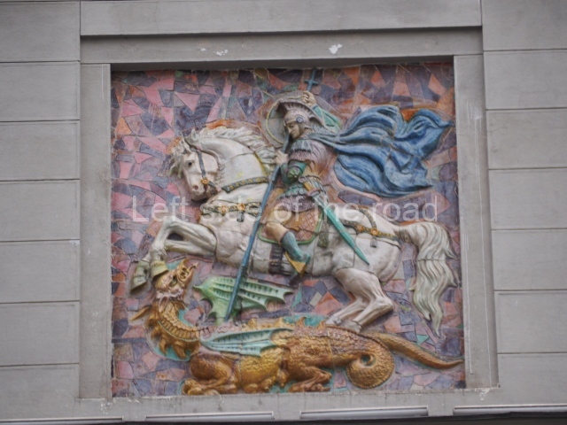The exterior façade of the building includes two images of Saint George – one of him killing the dragon and the other on his stay in heaven. These appear to be coloured mosaics but I have no idea whether these were covered in the past or just allowed to be there as they were part of the original decoration. Also of interest from the original design are the four art deco statues which flank the image of George, allegories for early 20th industry and transport.