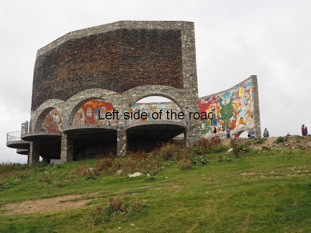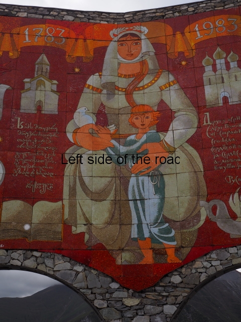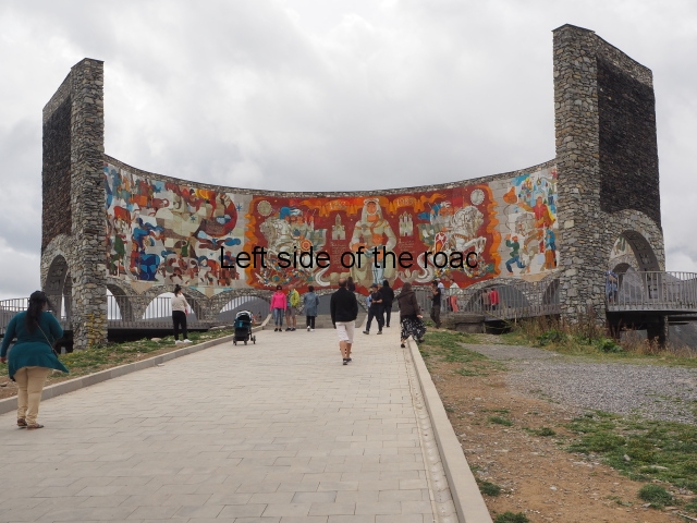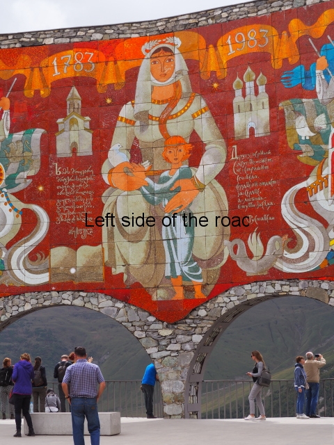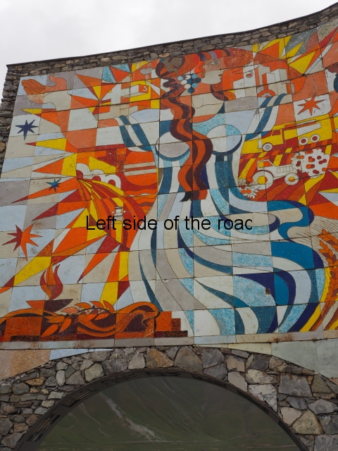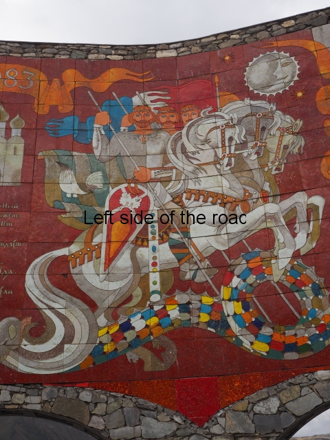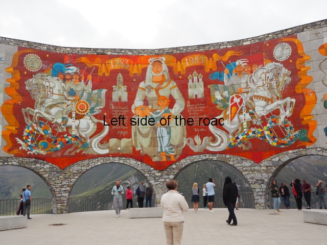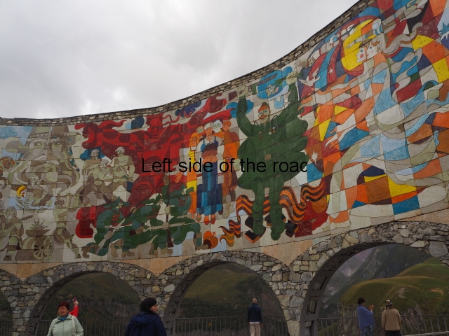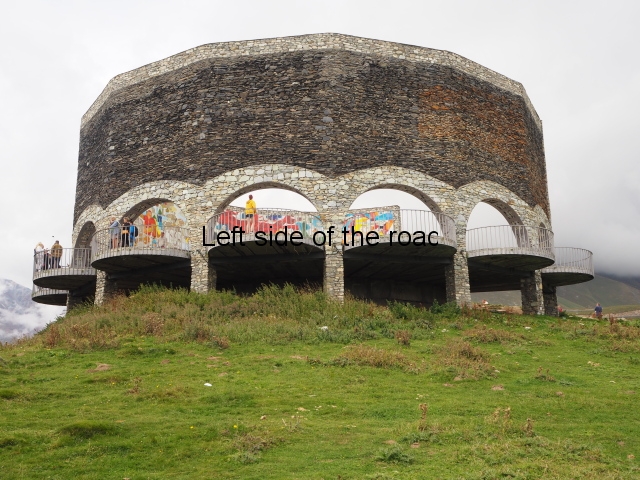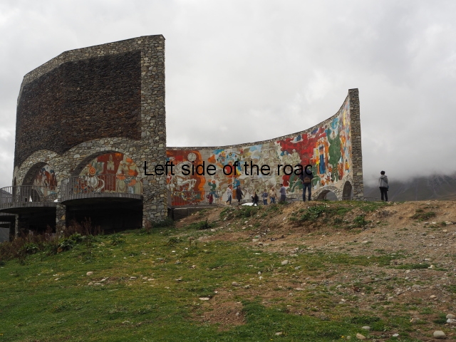 The Soviet–Georgia Friendship Monument or Treaty of Georgievsk Monument is a monument built in 1983 to celebrate the bicentennial of the Treaty of Georgievsk and the ongoing friendship between Soviet Georgia and Soviet Russia. Located on the Georgian Military Highway between the ski resort town of Gudauri and the Jvari pass, the monument is a large round stone and concrete structure overlooking the Devil’s Valley in the Caucasus mountains. Inside the monument is a large tile mural that spans the whole circumference of the structure and depicts scenes of Georgian and Russian history.