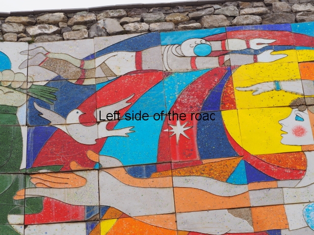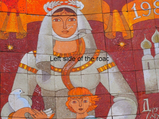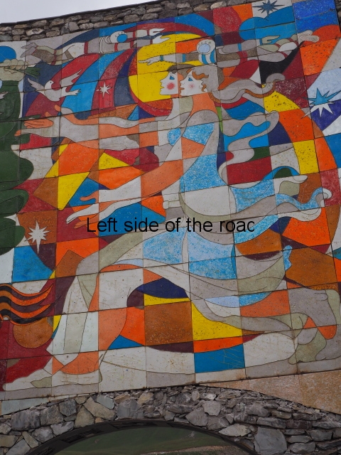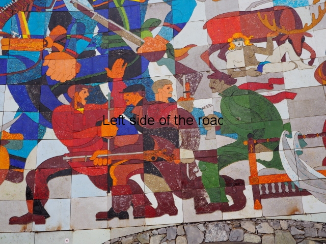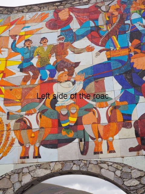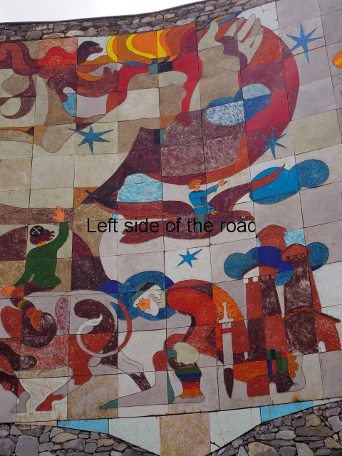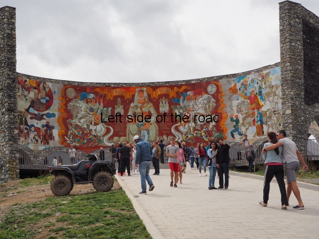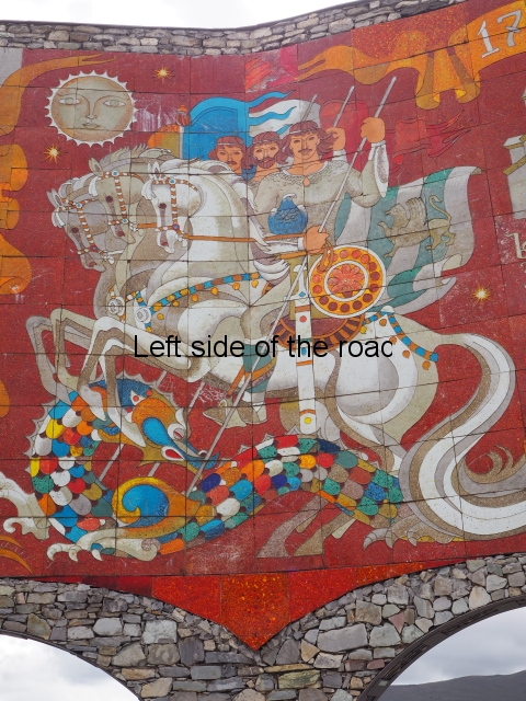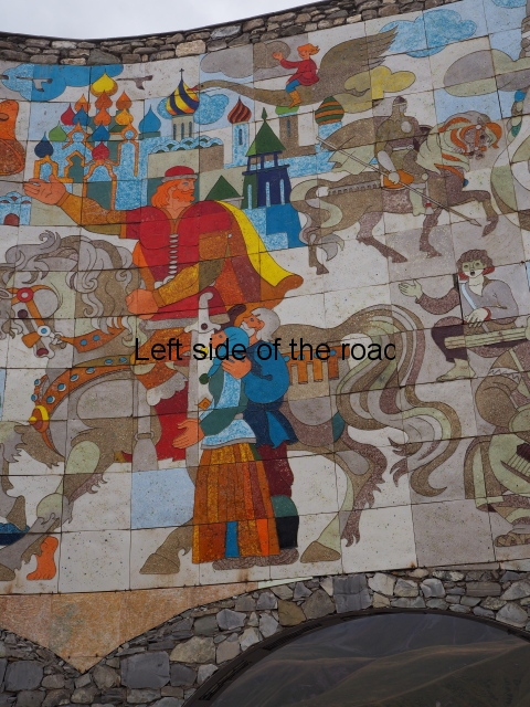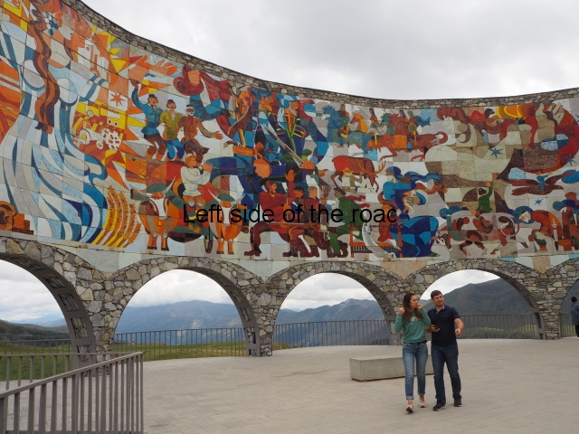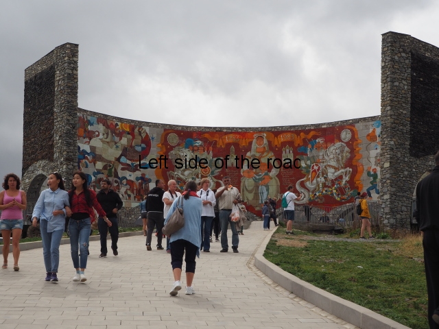 The Soviet–Georgia Friendship Monument or Treaty of Georgievsk Monument is a monument built in 1983 to celebrate the bicentennial of the Treaty of Georgievsk and the ongoing friendship between Soviet Georgia and Soviet Russia. Located on the Georgian Military Highway between the ski resort town of Gudauri and the Jvari pass, the monument is a large round stone and concrete structure overlooking the Devil’s Valley in the Caucasus mountains. Inside the monument is a large tile mural that spans the whole circumference of the structure and depicts scenes of Georgian and Russian history.