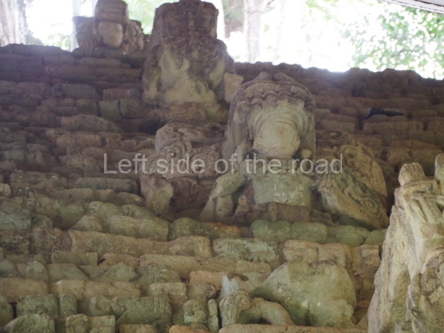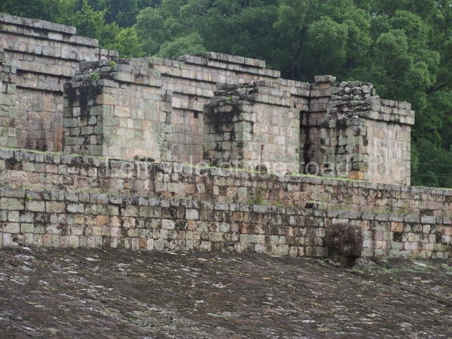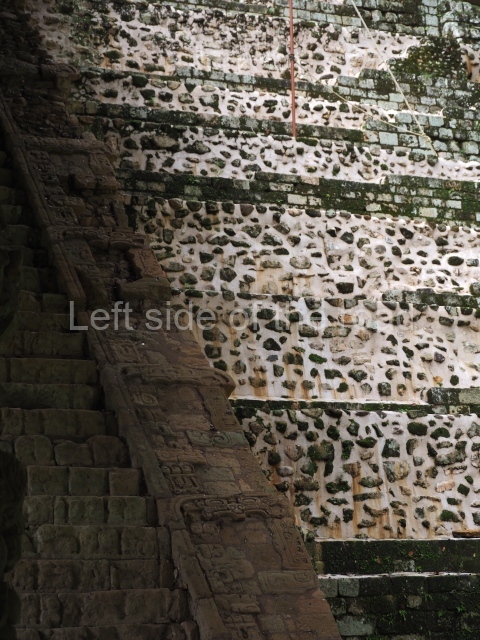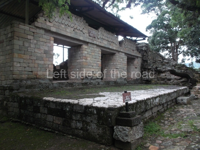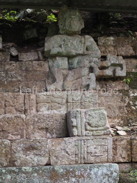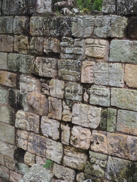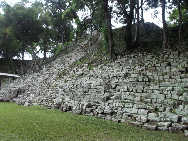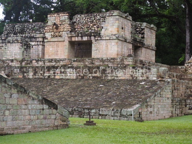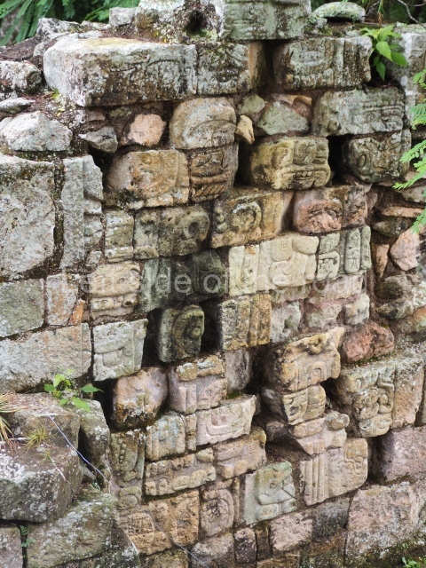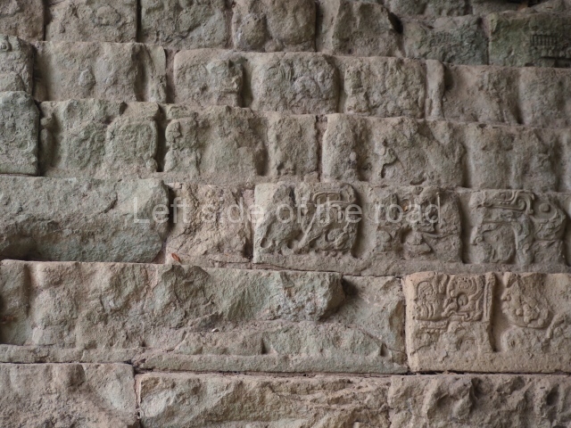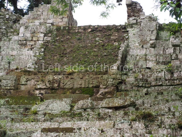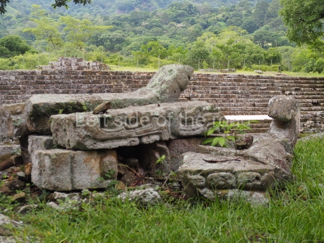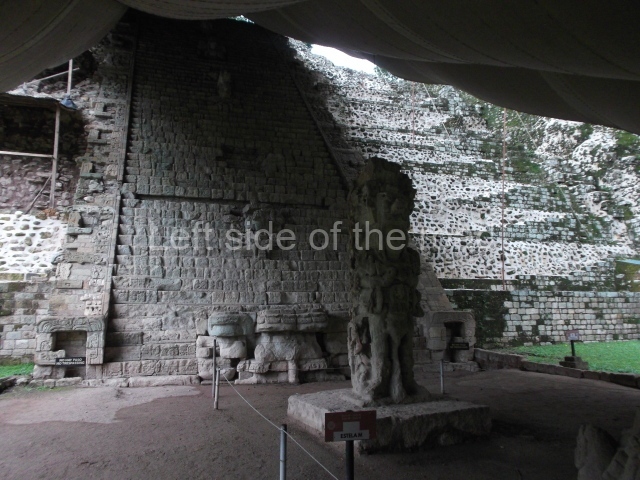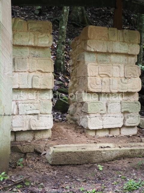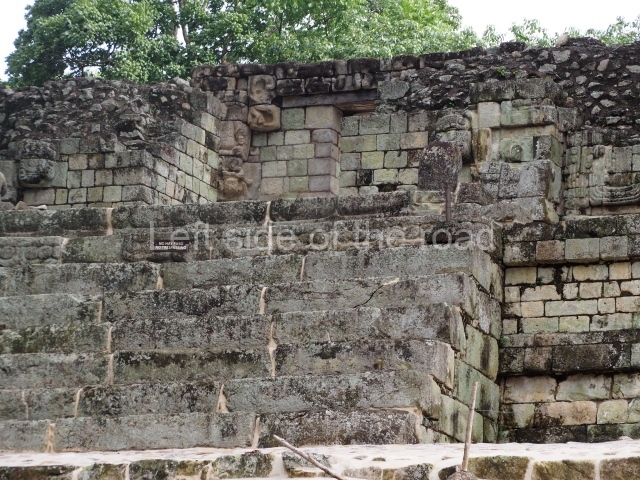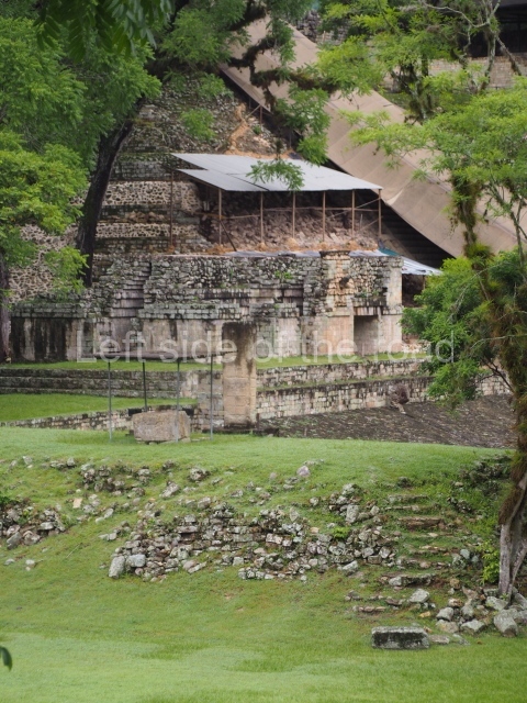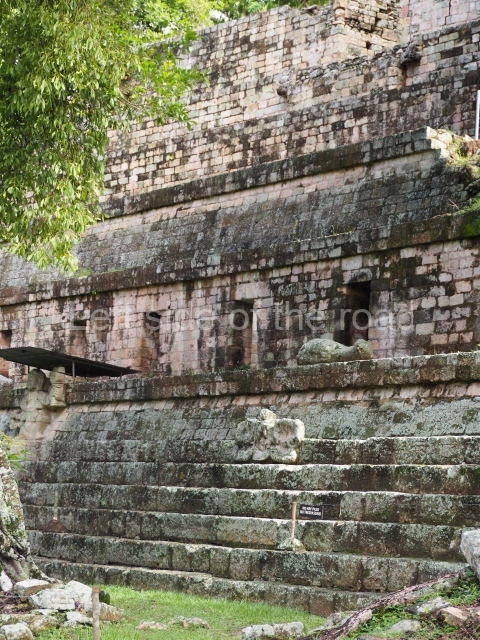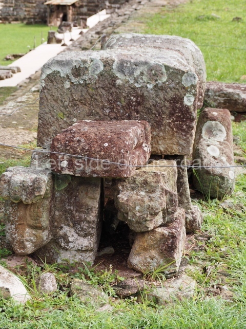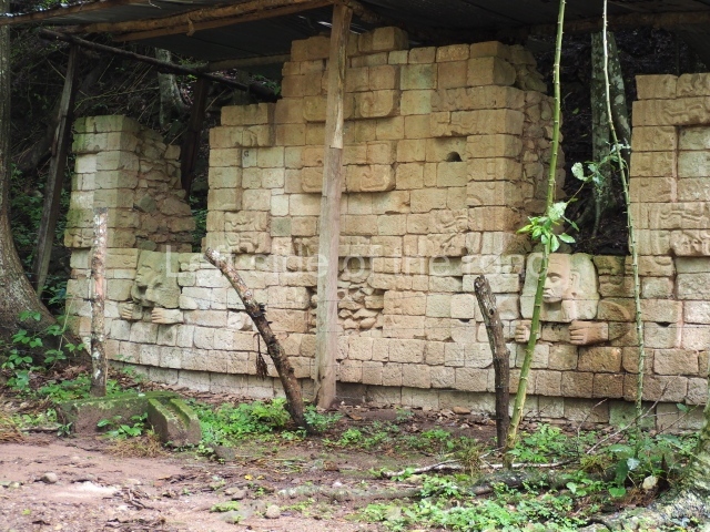 Situated on the west side is Structure 22A, known as the Popol Nah or the House of Council, whose upper facade depicts geometric patterns representing a mat; it once contained glyphs alluding to communities or districts that were part of Copan, as well as a few dates from the ritual calendar. Behind Temple 22A stand the ruins of the temple that once graced the top of Structure 26; situated between the two buildings is Structure 230, which has the same design of interior rooms. It was once decorated with bones and skulls but these are now on display in the Sculpture Museum. Returning to the East Court, situated on the west side of Structure 22 is Structure 21A, which has two bays side by side; beyond it are the ruins of Temple 21, known as the Temple of Knives because of the sculptures associated with it. Structures 20 and 19, whose main facades faced west, once flanked the west side of the court but were lost to the river. Temple 20 is known as the House of the Bats after the sculptures of these animals that were found there but are now on display in the site museum. Life-size sculptures of jaguars stand on the platform preceding these temples. Situated at ground level are the tunnels leading to the sub-structures of temples 22, 21A and 20; the tunnels come out at the gap left by the landslide, revealing the stratigraphic sequence of the Acropolis. It is also possible to see the Ante substructure with its Peten-style apron moulding, masks and glyphic steps. The entrance on the south side of the plaza leads to the sub-structures of Temple 10L16, permitting a view of the partial remains of the Rosalila Temple and other constructions.