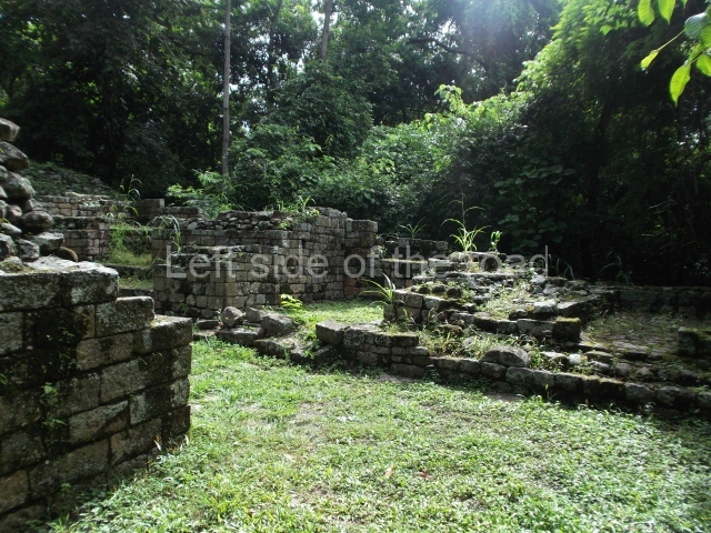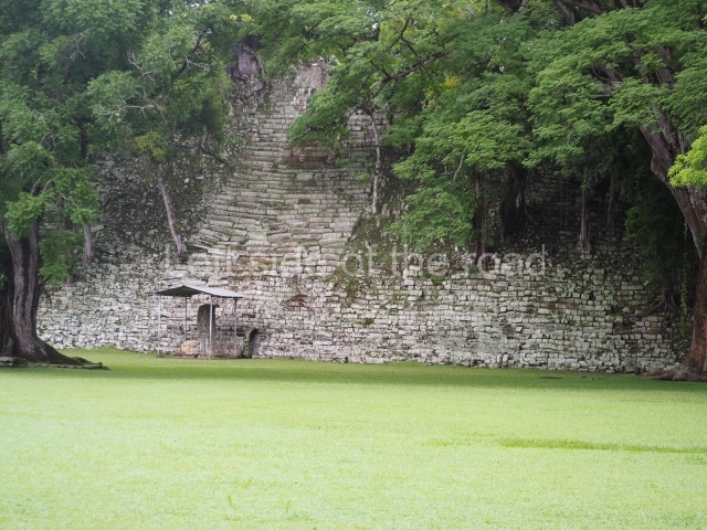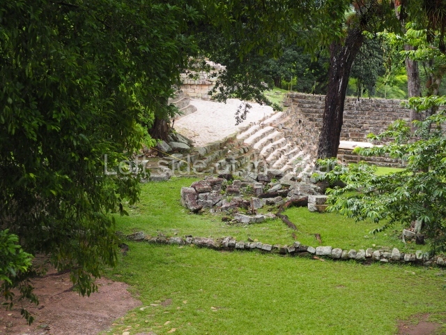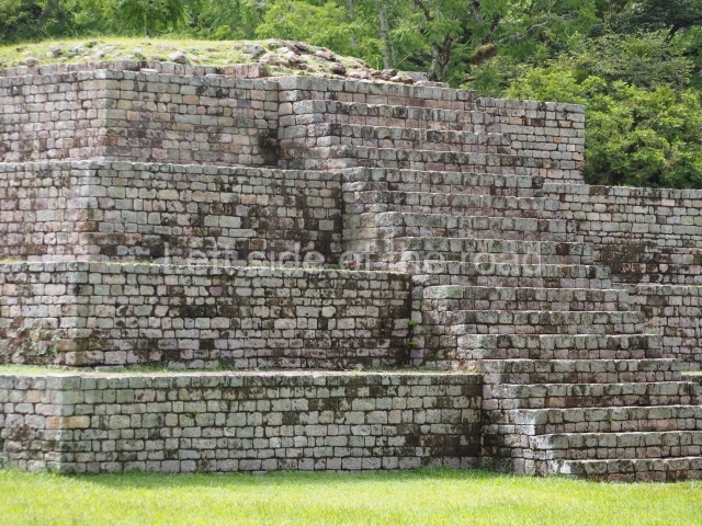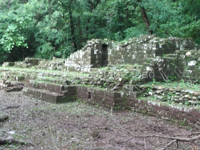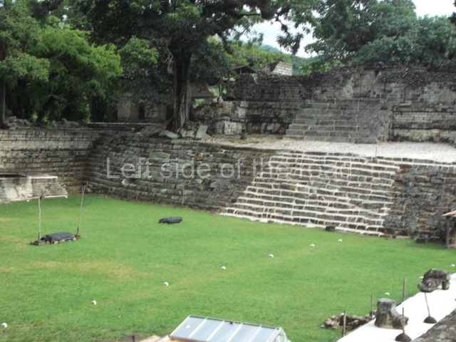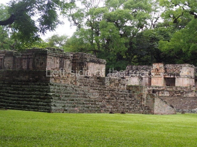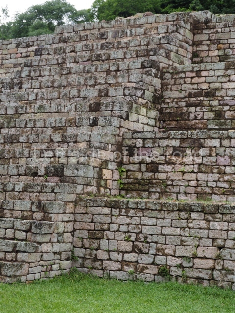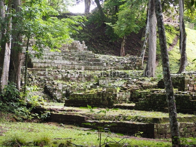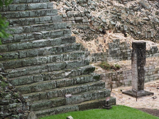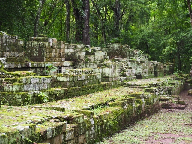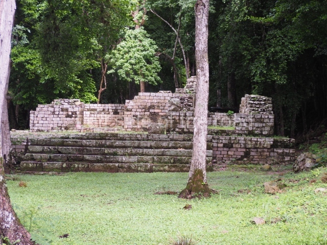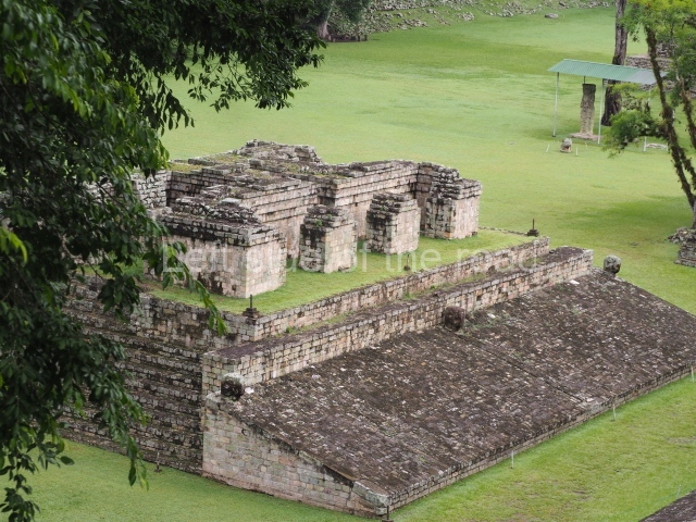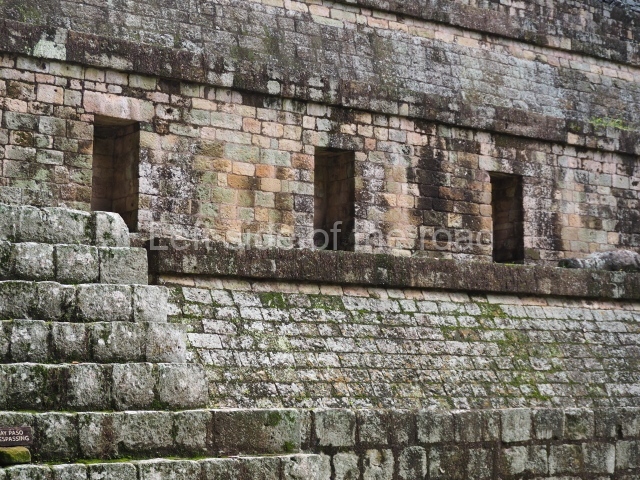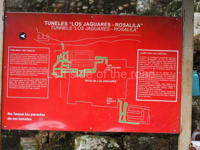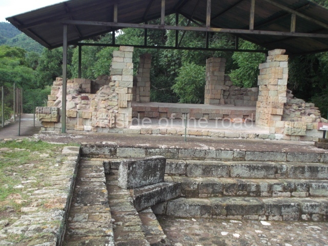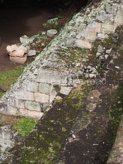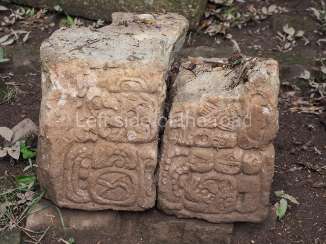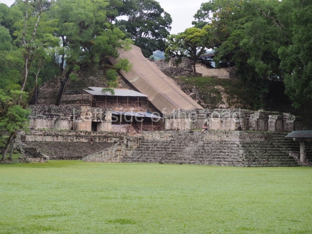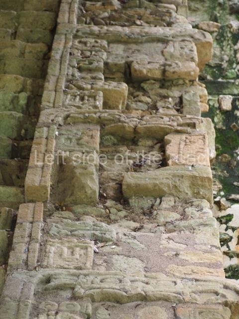 Situated on the west side is Structure 22A, known as the Popol Nah or the House of Council, whose upper facade depicts geometric patterns representing a mat; it once contained glyphs alluding to communities or districts that were part of Copan, as well as a few dates from the ritual calendar. Behind Temple 22A stand the ruins of the temple that once graced the top of Structure 26; situated between the two buildings is Structure 230, which has the same design of interior rooms. It was once decorated with bones and skulls but these are now on display in the Sculpture Museum. Returning to the East Court, situated on the west side of Structure 22 is Structure 21A, which has two bays side by side; beyond it are the ruins of Temple 21, known as the Temple of Knives because of the sculptures associated with it. Structures 20 and 19, whose main facades faced west, once flanked the west side of the court but were lost to the river. Temple 20 is known as the House of the Bats after the sculptures of these animals that were found there but are now on display in the site museum. Life-size sculptures of jaguars stand on the platform preceding these temples. Situated at ground level are the tunnels leading to the sub-structures of temples 22, 21A and 20; the tunnels come out at the gap left by the landslide, revealing the stratigraphic sequence of the Acropolis. It is also possible to see the Ante substructure with its Peten-style apron moulding, masks and glyphic steps. The entrance on the south side of the plaza leads to the sub-structures of Temple 10L16, permitting a view of the partial remains of the Rosalila Temple and other constructions.