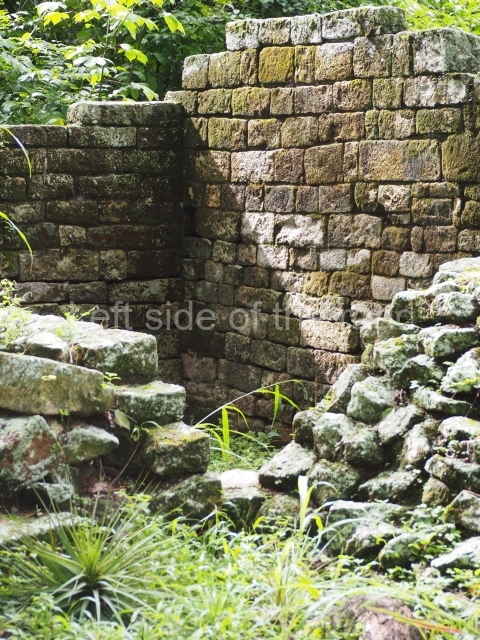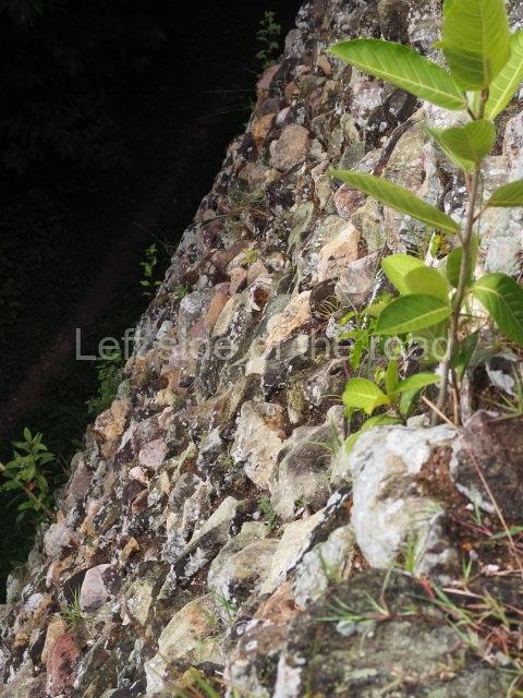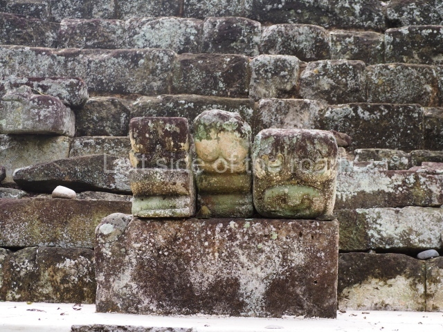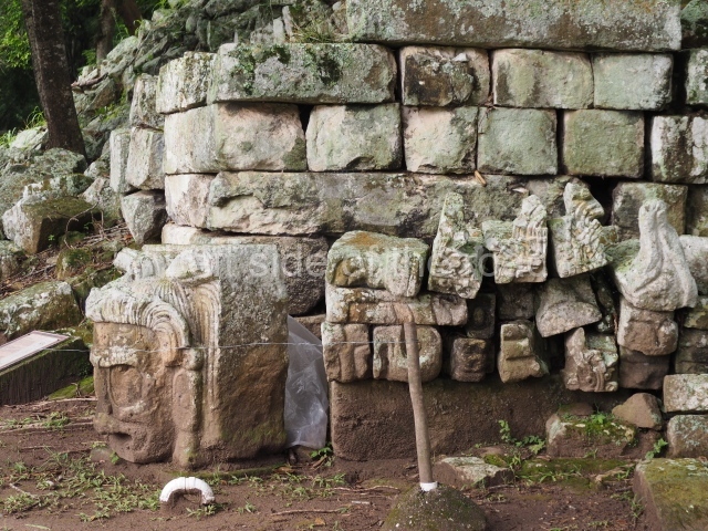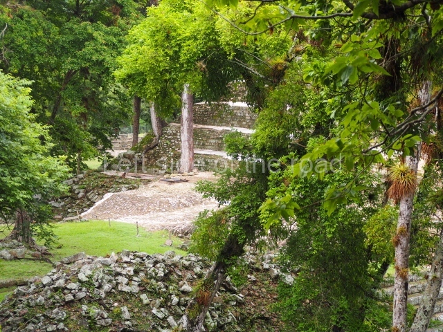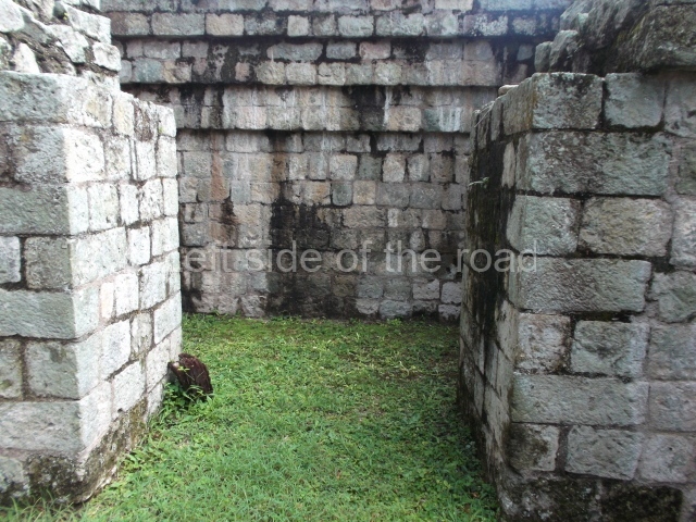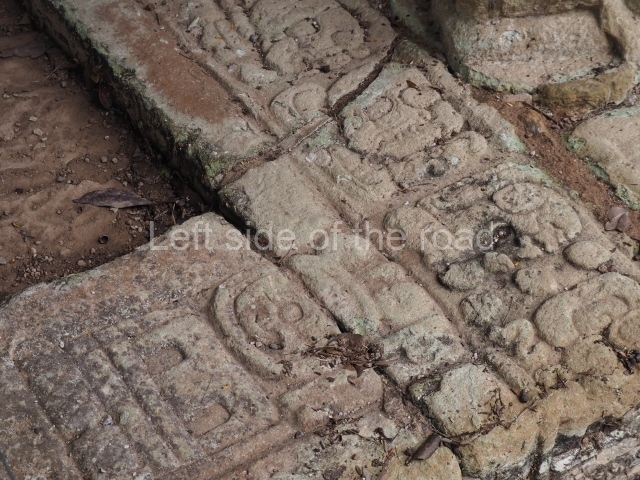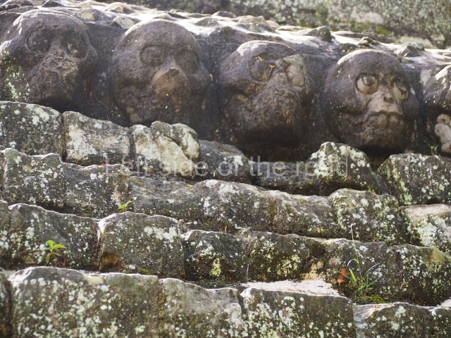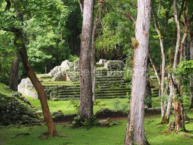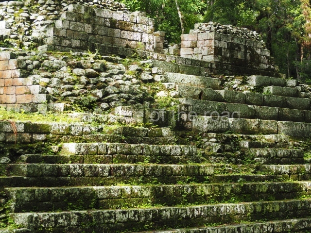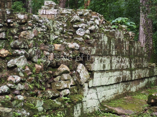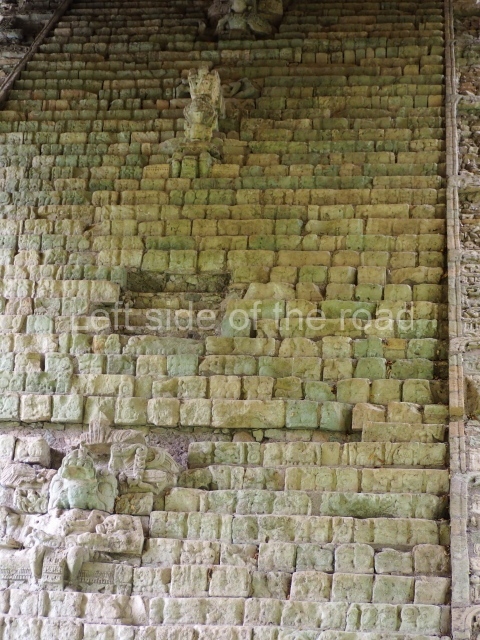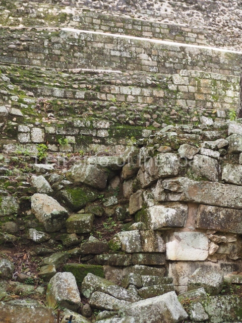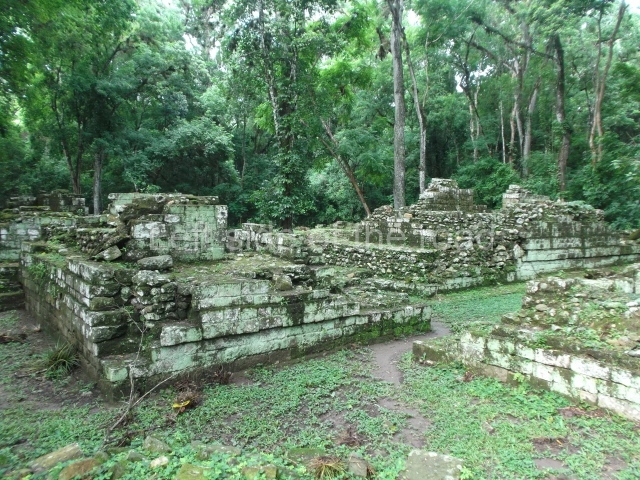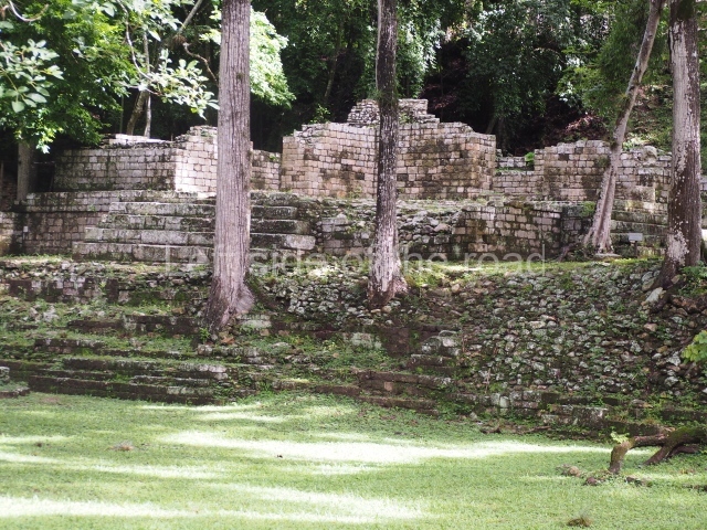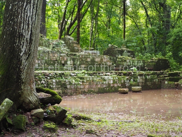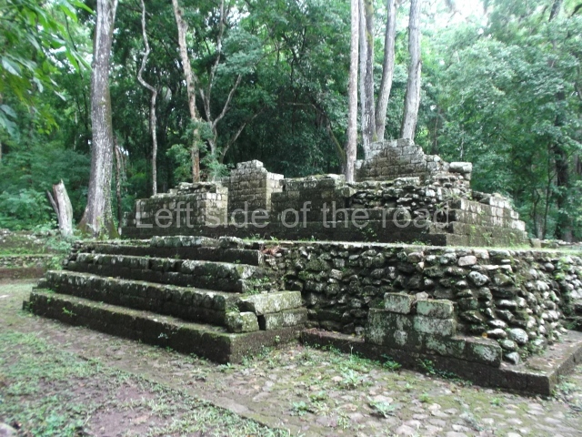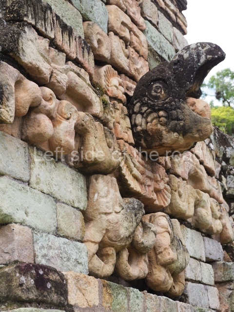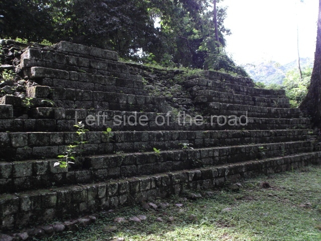 Situated on the west side is Structure 22A, known as the Popol Nah or the House of Council, whose upper facade depicts geometric patterns representing a mat; it once contained glyphs alluding to communities or districts that were part of Copan, as well as a few dates from the ritual calendar. Behind Temple 22A stand the ruins of the temple that once graced the top of Structure 26; situated between the two buildings is Structure 230, which has the same design of interior rooms. It was once decorated with bones and skulls but these are now on display in the Sculpture Museum. Returning to the East Court, situated on the west side of Structure 22 is Structure 21A, which has two bays side by side; beyond it are the ruins of Temple 21, known as the Temple of Knives because of the sculptures associated with it. Structures 20 and 19, whose main facades faced west, once flanked the west side of the court but were lost to the river. Temple 20 is known as the House of the Bats after the sculptures of these animals that were found there but are now on display in the site museum. Life-size sculptures of jaguars stand on the platform preceding these temples. Situated at ground level are the tunnels leading to the sub-structures of temples 22, 21A and 20; the tunnels come out at the gap left by the landslide, revealing the stratigraphic sequence of the Acropolis. It is also possible to see the Ante substructure with its Peten-style apron moulding, masks and glyphic steps. The entrance on the south side of the plaza leads to the sub-structures of Temple 10L16, permitting a view of the partial remains of the Rosalila Temple and other constructions.