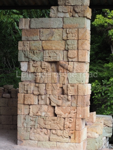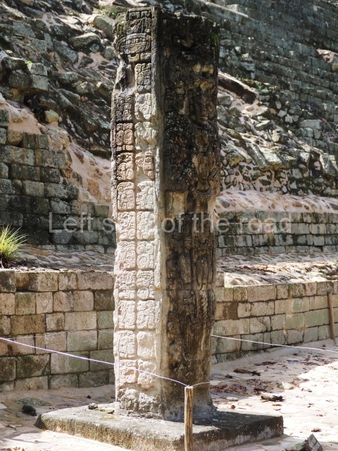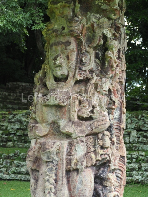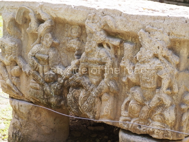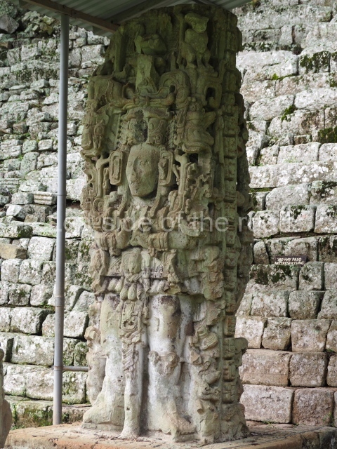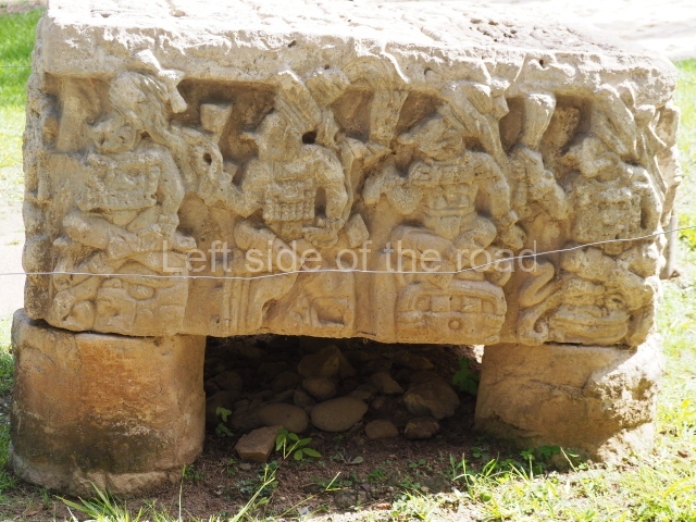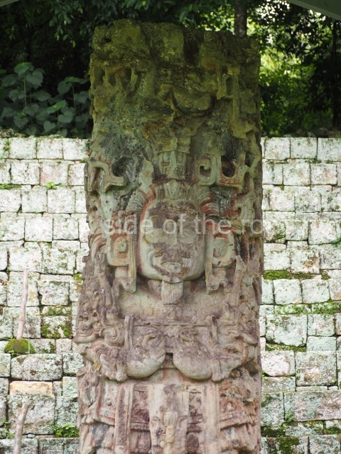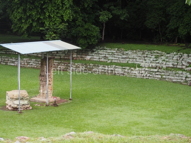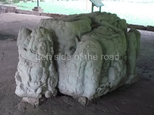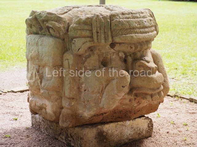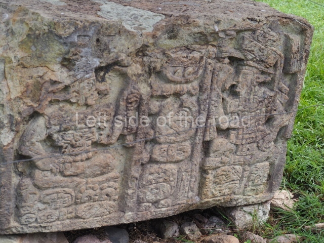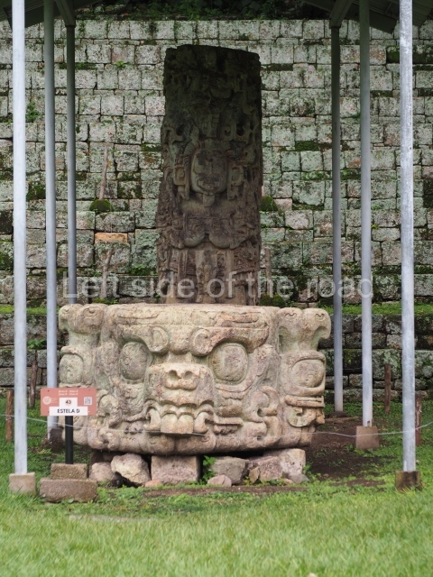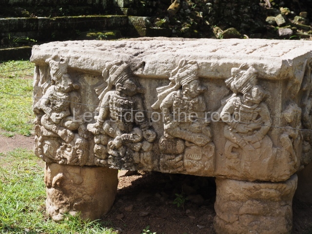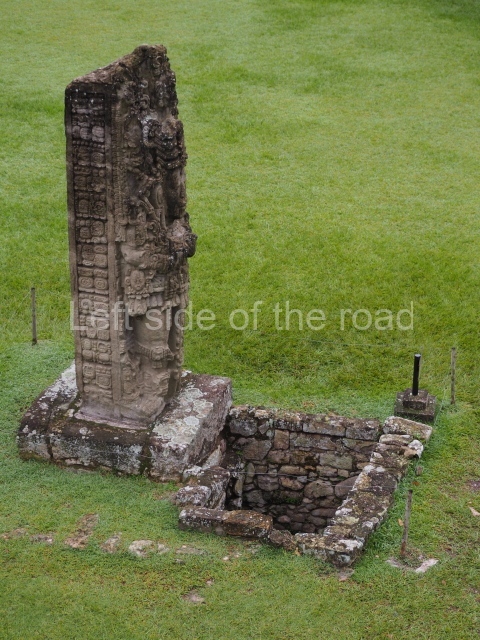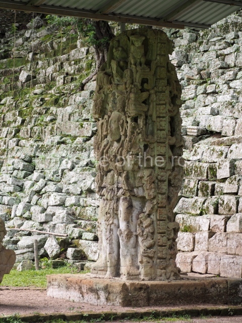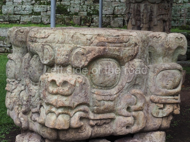 Altar Q. One of the most famous pieces at Copan due to its unusual format, the altar represents 16 seated dignitaries on all four sides an a glyphic inscription at the top. It stands opposite Structure 10L-16, dedicated to the founder of the dynasty, K’inich Yax K’uk’ Mo’. The glyphic names are shown beneath each ruler, almost as if they were thrones. The exception is K’uk’ Mo’, whose name is inscribed on his headdress. The text across the top of the stela alludes to five events, three during the founder’s reign and two during that of his final successor, in keeping with the function of the monument.