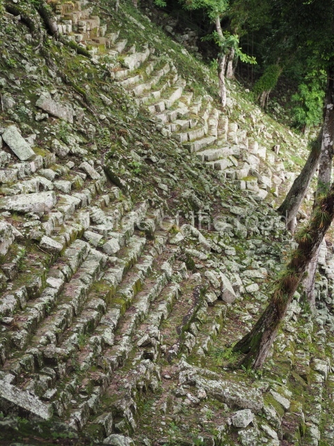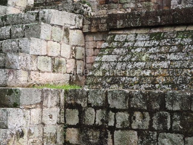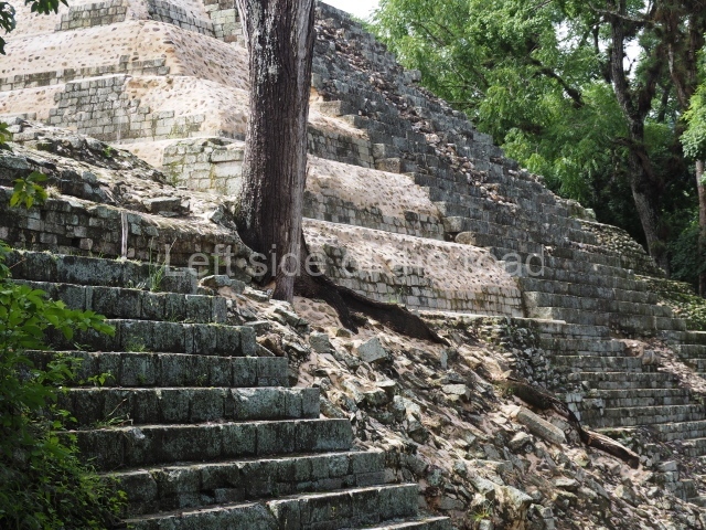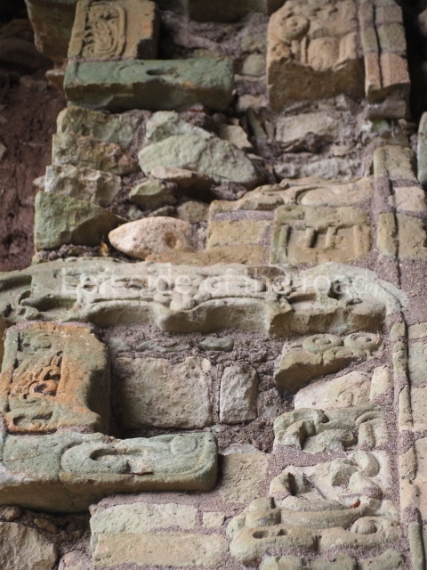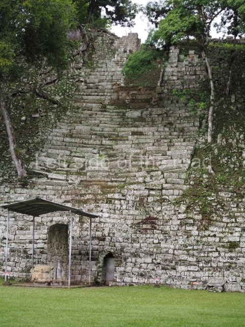 The structure consists of 11 tiers with a band of moulding along the top edge. At the top of this imposing structure there once stood an interesting temple, whose facade displayed a varied and complex warrior decoration encompassing sculptures of hearts, rectangular shields, masks with Tlaloc characteristics and warriors in groups of six; inside the temple, a hieroglyphic text offers a short narrative of the dynastic sequence up to Ruler 15, accompanied by glyphs that are reminiscent of the Teotihuacan style, totally unlike the symbols commonly used on the plateau, probably a type of pseudo script. Both the decorative remains and the glyphic text are nowadays on display in the Sculpture Museum. In front of the construction stands Stela M, which depicts Ruler 15 and his altar. One of the sub-structures yielded the funerary temple of K’ahk Uti’ Witz’ K’awiil – now known as Smoke Imix – which contained, among other items, the magnificent incense burners representing the 12 rulers that had governed Copan to date; these are currently on display in the museum in Copan Ruinas. Flanking the south side of the Plaza is another enormous stairway composed of megaliths and surmounted by Temple 10L-11. This structure has its own stairway and is preceded by Stela N. In fact, this would be the formal entrance to the restricted area comprising the main Acropolis and adjacent plazas. Nowadays, access is via a path on the west side.