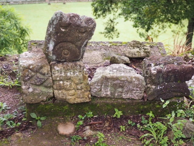 The Ball Court consists of a square platform that seals the north and north-east ends; the north end is higher and situated at its uppermost points are Stela 2 and Altar L. The rear part of the sloping sides of the court are formed by structures 9 and 10. The former occupies the west side and has its own access from the west, opposite which stands Stela 1; on its other three sides it has stairways. The top entrance is defined by a portico with three accesses leading to a large bay; in the middle of this area, a corridor leads to another identical portico at the west end. Situated on the north and south sides are the entrances to the double-bay rooms; all the vaults adopt the form of inverted stairs, albeit with a longer springing line. Meanwhile, the uppermost section of Structure 10 situated behind the east slope displays a similar design with an elongated room overlooking a central corridor that runs from one side of the construction to the other; it also has two bays at the north and south ends, but in this case containing a single, narrow room with similarly stepped vaults. The part of the facades that once overlooked the court were decorated with slightly sloping friezes, on which there were fabulous stone reliefs of macaws with their wings extended and their tail projecting upwards. Their open claws pointed down, sculpted in high-relief, almost in the round but embedded into the frieze, while their heads and open beaks rose erect in all their majesty. The principal decorative motif for the court seems to allude to various birds associated with the sun, and to the founder of the Copan dynasty. Only one of these birds can be admired in situ, but the remainder are on display in the Sculpture Museum. In fact, visitors can only see four of the original eight birds, four on each side of the court, two perched on pilasters and two at the front corners. The frieze culminated in a moulding with sculpted motifs and four merlons above each macaw, which again are now on display in the Sculpture Museum.