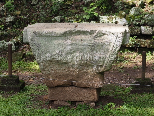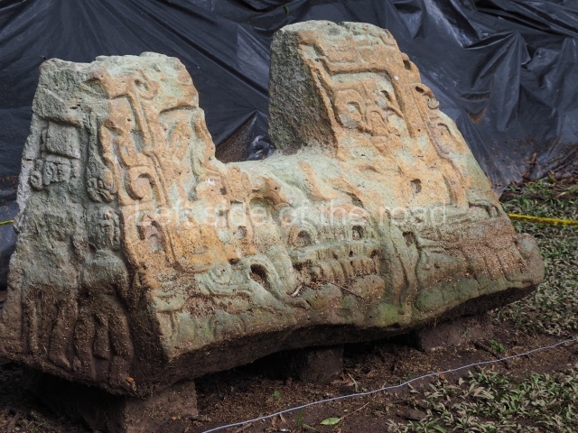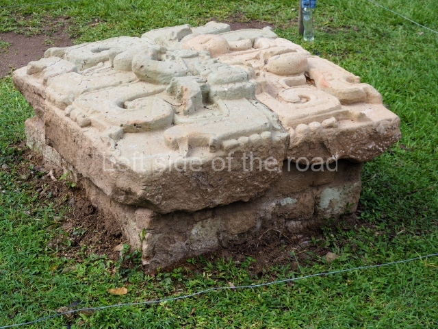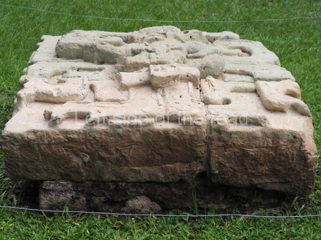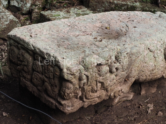 Altar G. This altar is composed of three thin pieces that represent two-headed serpents with decorative feathers on their back. The serpents’ bodies are arched to permit an intervening space that was filled with glyphs. G2 and G3 are parallel, while G1 is larger and at its east end shows the gaunt, open-mouthed serpent head from which God K emerges. The former two pieces were dedicated by Yax Pasaj Chan Yopaat around AD 795 and the latter a few years later in 800. motmot marker.