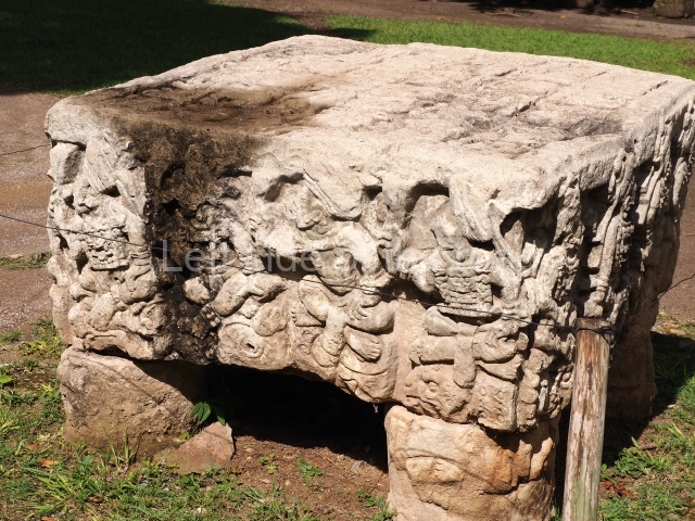 Altar T. The top of this extraordinary monument represents a crocodile between whose limbs and head are a series of unidentified dignitaries with glyphs. The front and sides of the altar depict 12 figures, six of which are human and six zoomorphic. On the front, the scene is divided by a series of glyphic cartouches. The altar was dedicated by Yax Pasaj Chan Yopaat in AD 792.