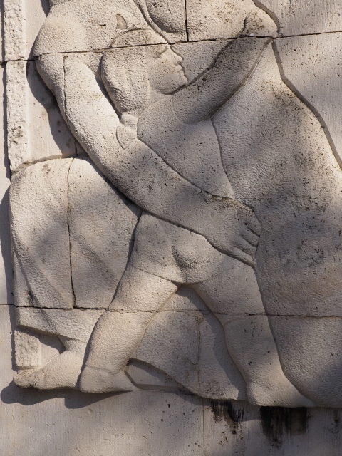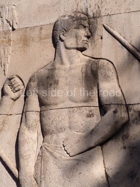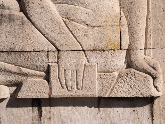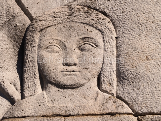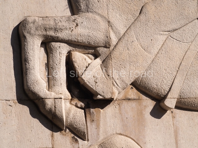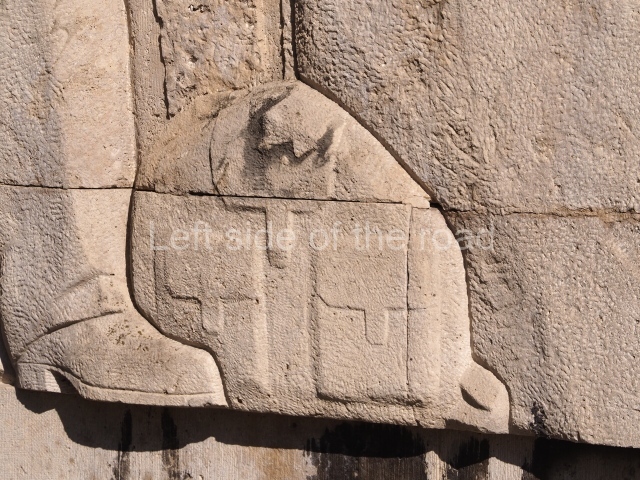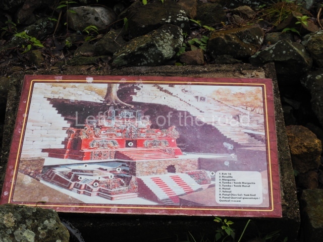 The East Plaza narrows to the south and on the east platform stands Building 18, the intact funerary monument of Ruler 16, Yax Pasaj Chan Yopaat, whose crypt is open to the public. The temple at the top has entrances on the north and south sides, framed by ornate reliefs depicting the ruler as a warrior. These reliefs are repeated on the jambstones. Inside, a north-facing bench is also decorated with reliefs. Proceeding southwards from the Acropolis visitors reach Building 29, an L-shaped structure. Its facades, nowadays partly reconstructed and on display in the Sculpture Museum, show wavy motifs that represent smoke or clouds, large sun disks inscribed with a fascinating but unidentified dignitary, and a geometric symbol which on the Mesoamerican plateau signifies the year, combined with two binder-mouldings of groups of rods positioned to form the letter X. This latter symbol can also be found in certain inscriptions on Altar Q and although it is crucial for understanding the origins of the dynasty it has yet to be deciphered.